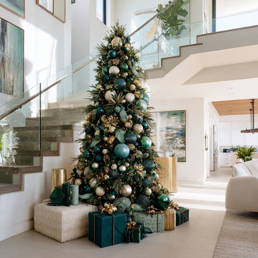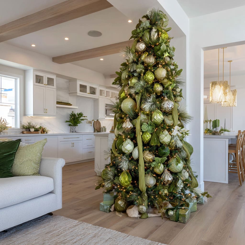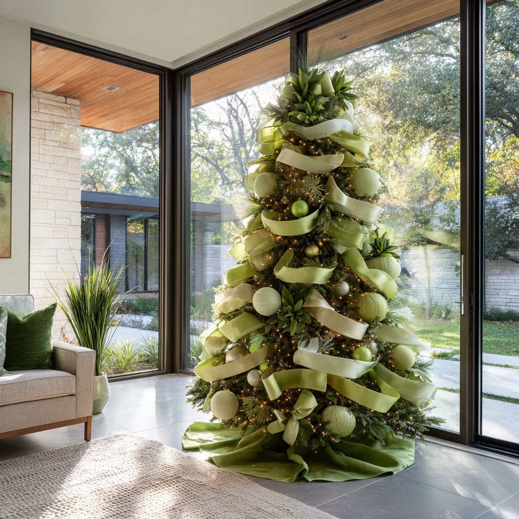 Even when combined with metallics, frosted whites, ivory tones, or small hints of champagne, the palette stays calm because green provides the anchor. These concepts show that green can serve as structure, texture, shape, and mood at the same time, making it one of the most adaptable approaches in green Xmas tree ideas for refined homes.