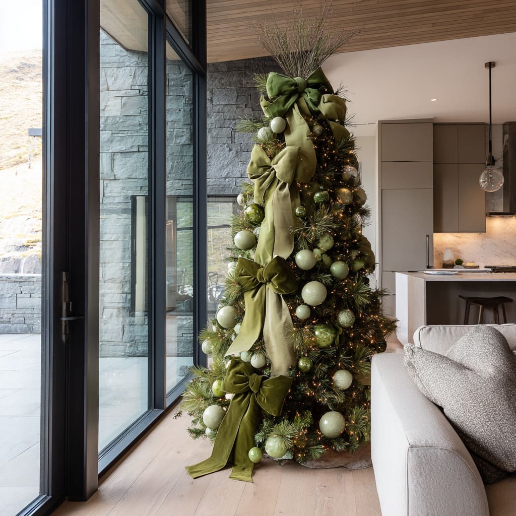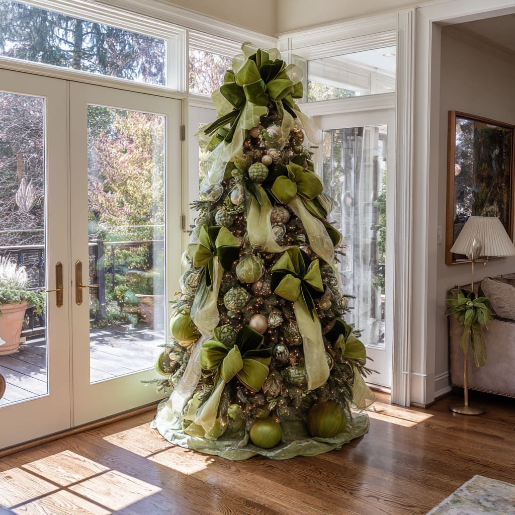 Many green Xmas tree ideas rely on the tactile richness of fabric—velvet bows, sheer drapes, wide ribbons, and textile clusters. In these compositions, fabric becomes more important than the ornaments themselves.