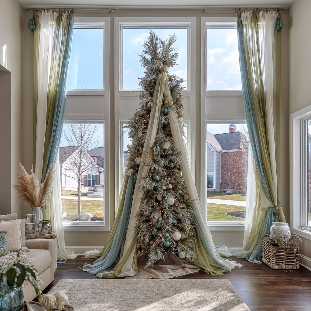 - Wide fabric swaths anchor the tree to the room