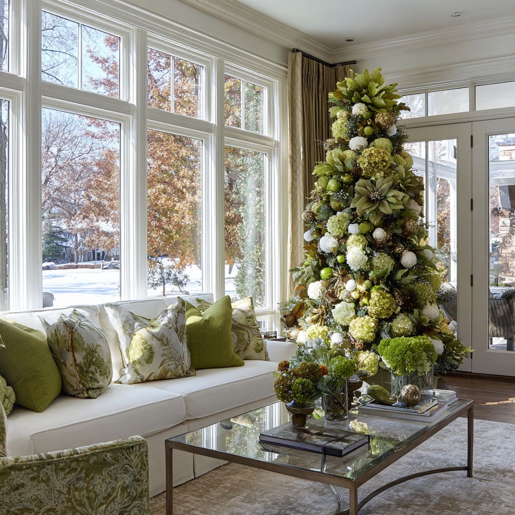 The result resembles a sculpted garden rather than a classic holiday tree. This approach blends winter décor with plant-based forms, making green feel natural, tactile, and layered.
