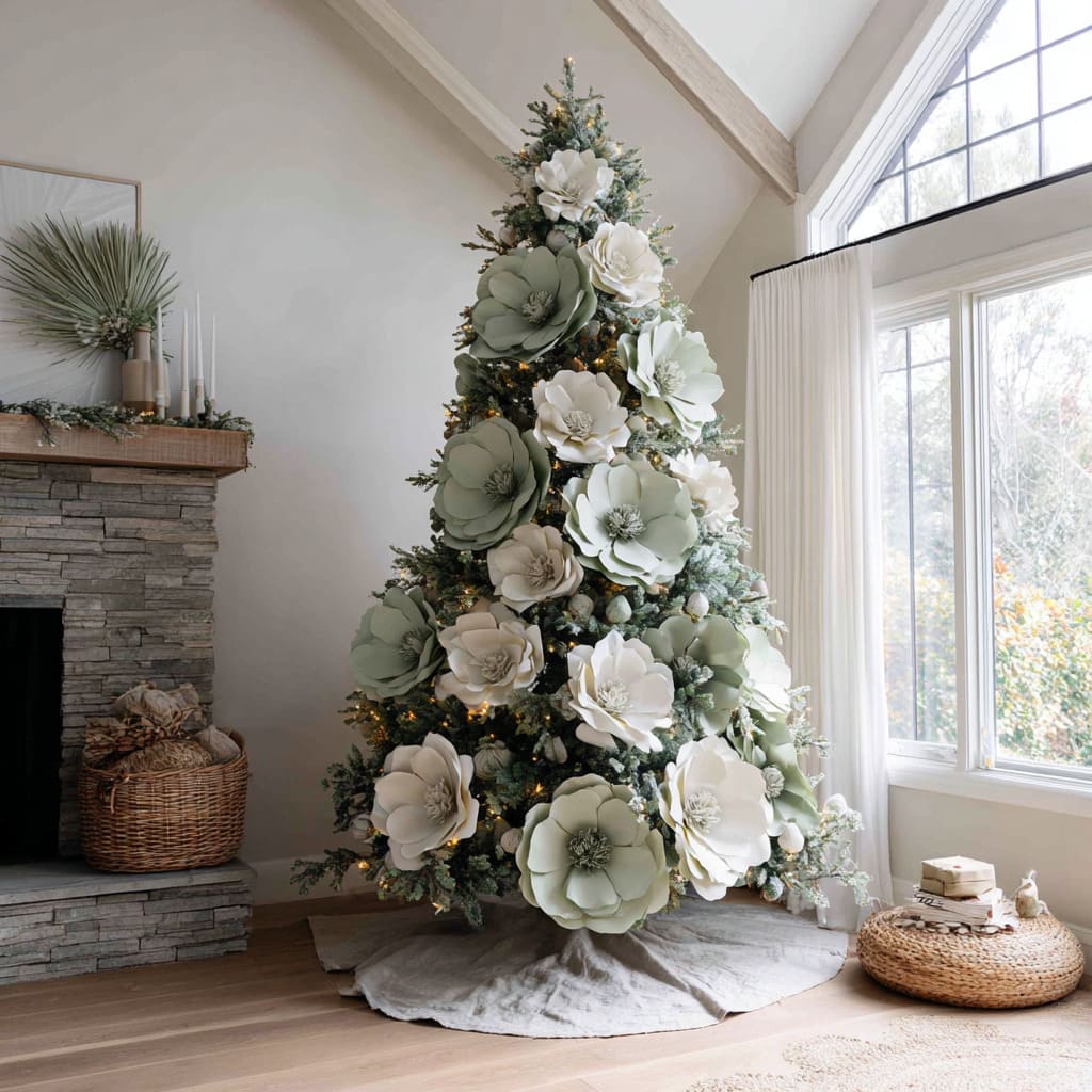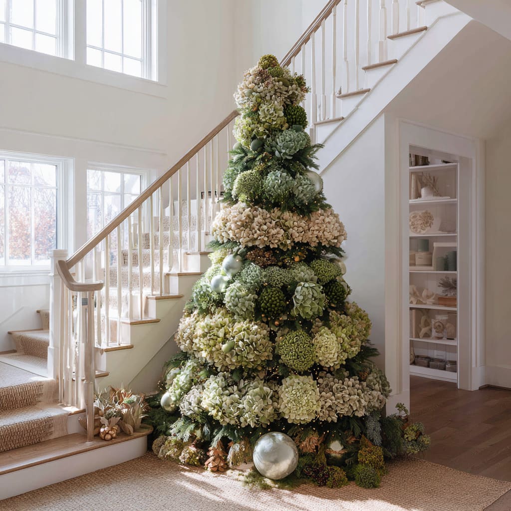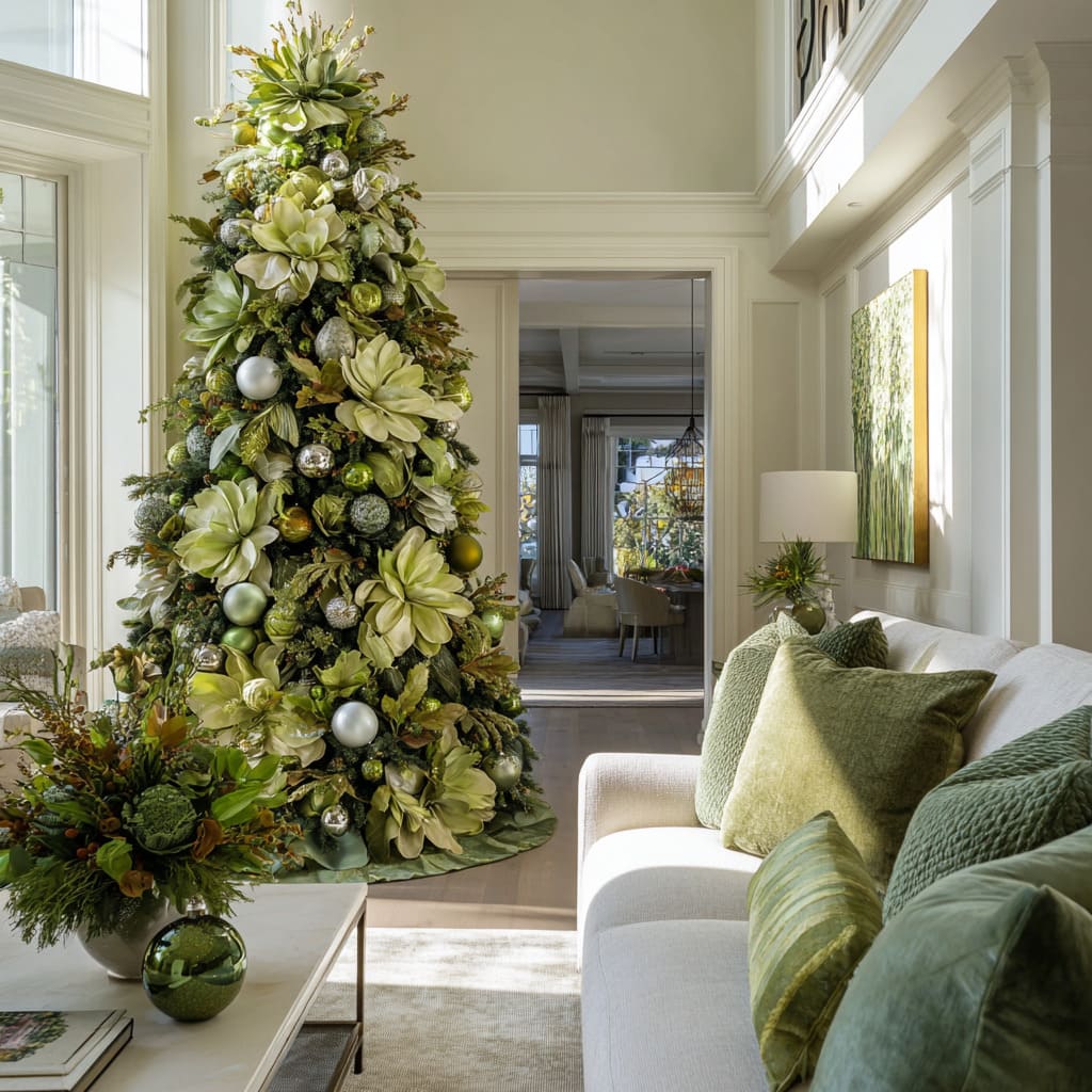 Some of the most distinctive green Christmas tree ideas can use botanical forms—hydrangea mounds, magnolia petals, palm leaves, pods, and dried stems—to create depth and variety. Instead of being decorative extras, these elements become the structure of the tree.