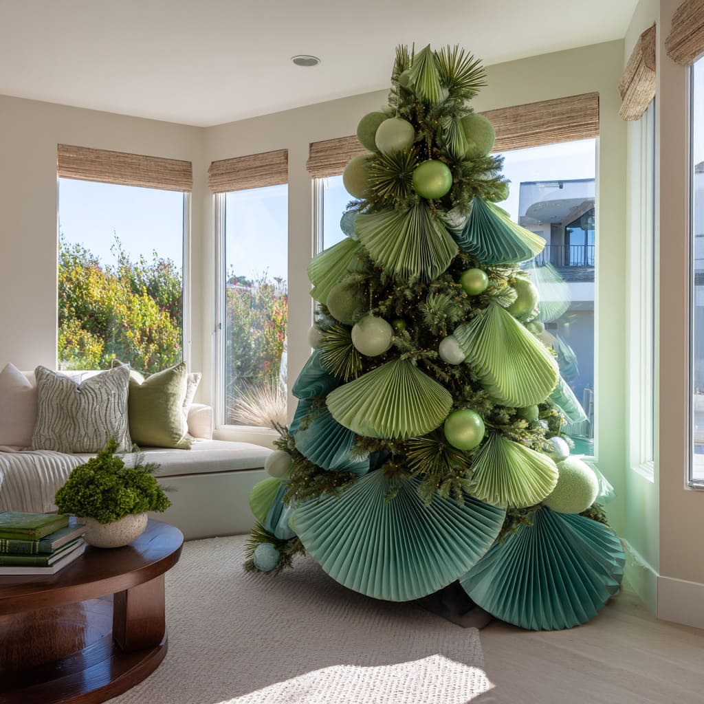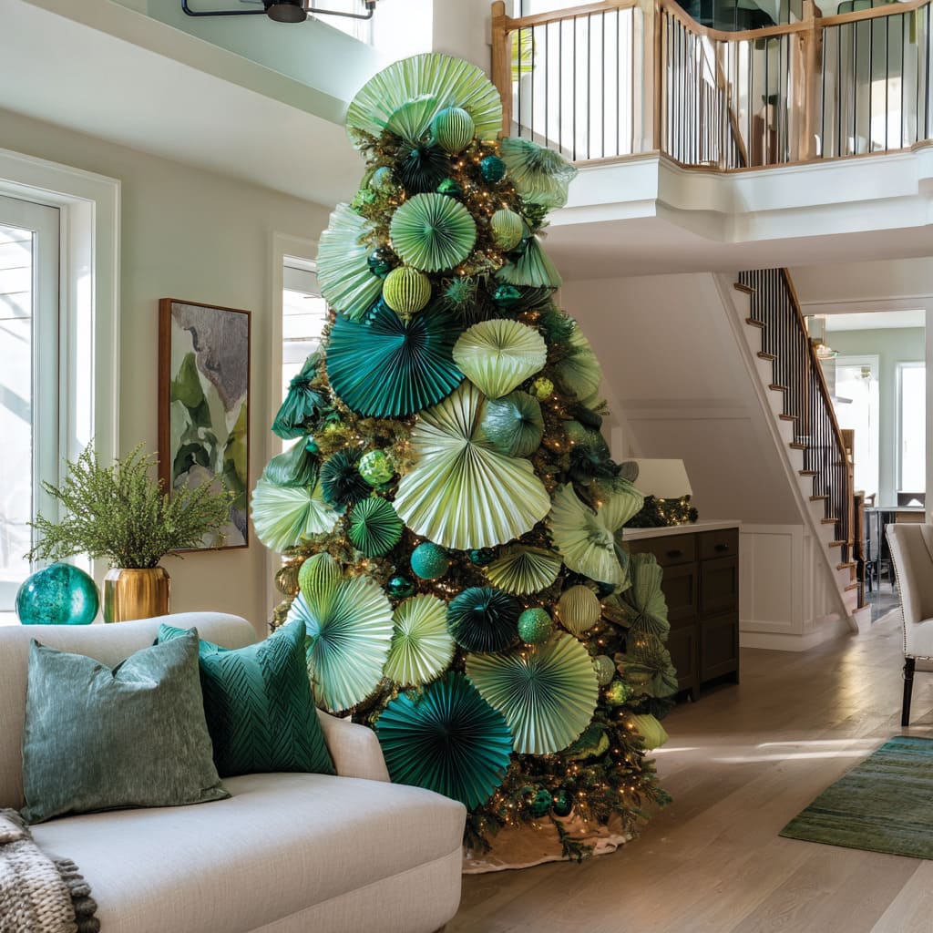Christmas tree ideas for green tree decorating reveal a welcome consistency: green adapts easily to many design directions without ever breaking the visual harmony of a room. Whether the tree is built from hydrangeas, pleated discs, soft drapes, velvet bows, geometric panels, or botanical clusters, green behaves as a connecting thread that links all these styles together.