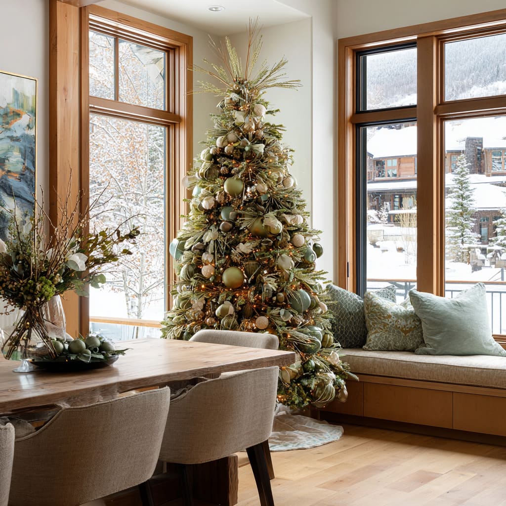 In rooms with wide windows or scenic views, the tree can become part of a dialogue with nature—especially in snowy or mountainous regions or homes with garden views. The outdoor tones guide the choice of greens on the tree.
