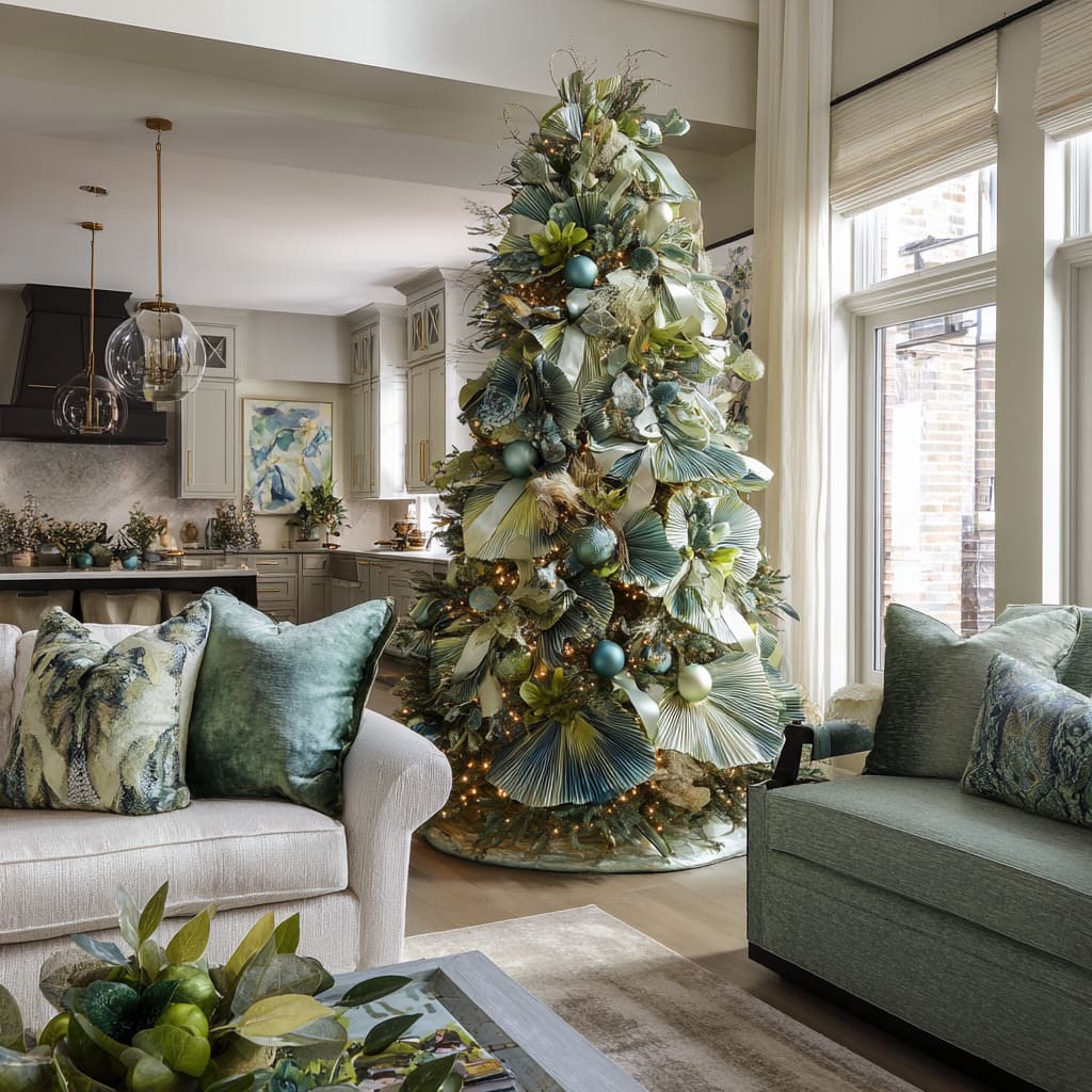 Because the scale of the room dictates the scale of decoration, the green palette appears intentional and grounded. The tree becomes part of the interior structure rather than a small accessory surrounded by large surfaces.