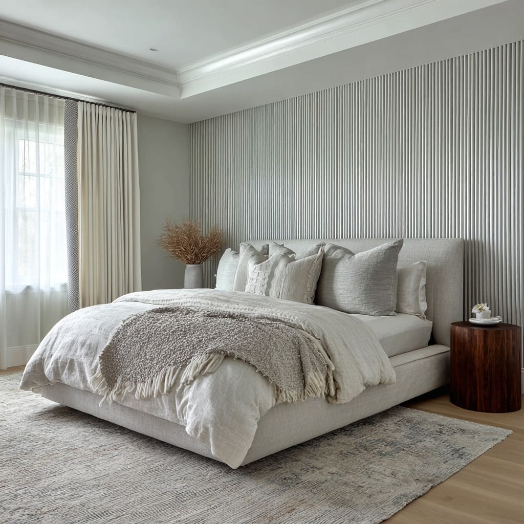 Every element—drapery pleats, headboard joints, flooring seams—acts as a conductor of rhythm. Vertical lines create elegance and containment, while horizontal planks or banded panels lengthen the visual horizon.