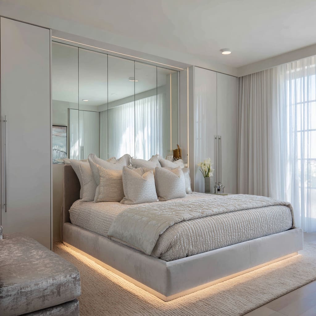 In such interiors, mirrors act like architectural tools rather than vanity features. Vertical mirror strips beside the bed extend daylight into corners.