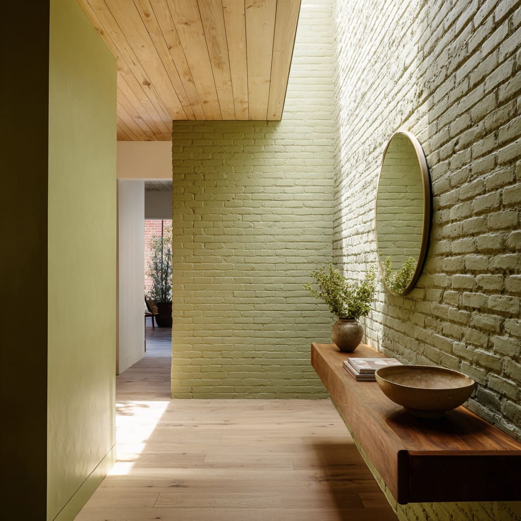 Green finds its depth not through brightness, but through the surfaces it occupies. Instead of repeating one paint finish, the most thoughtful green hall ideas use material variety to avoid visual fatigue.