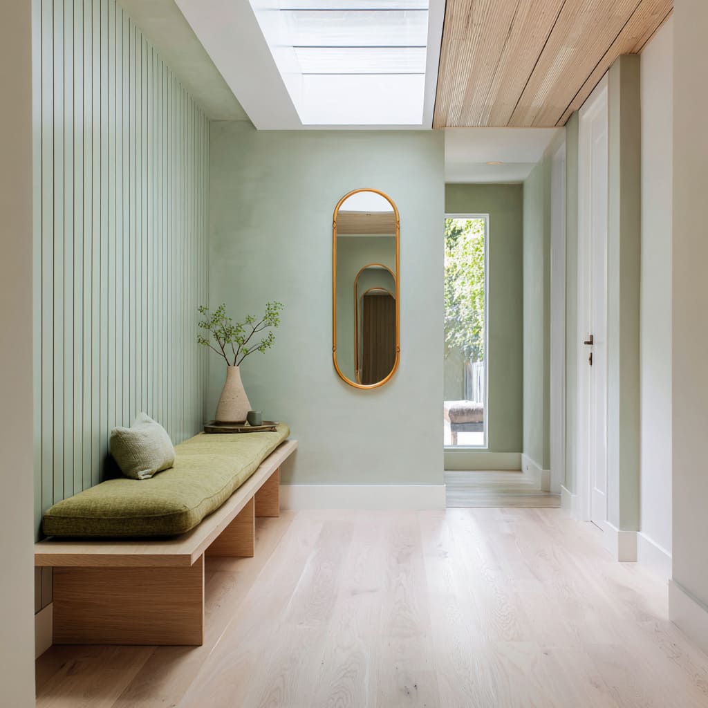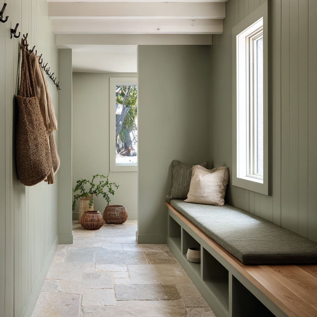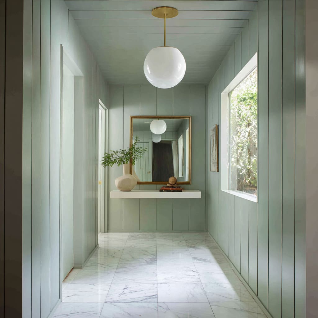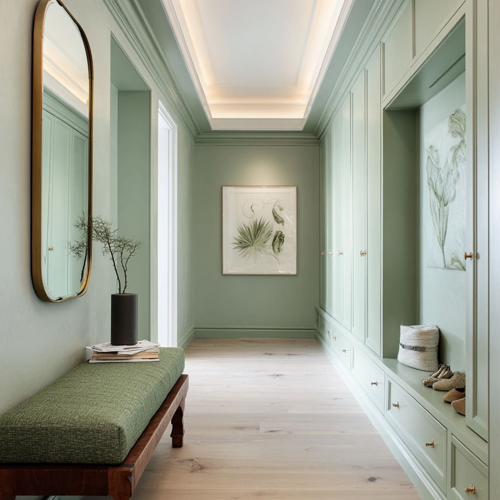 Especially in sage hallway ideas, this shift in temperature—not brightness—lets green stretch its personality without switching shades entirely.