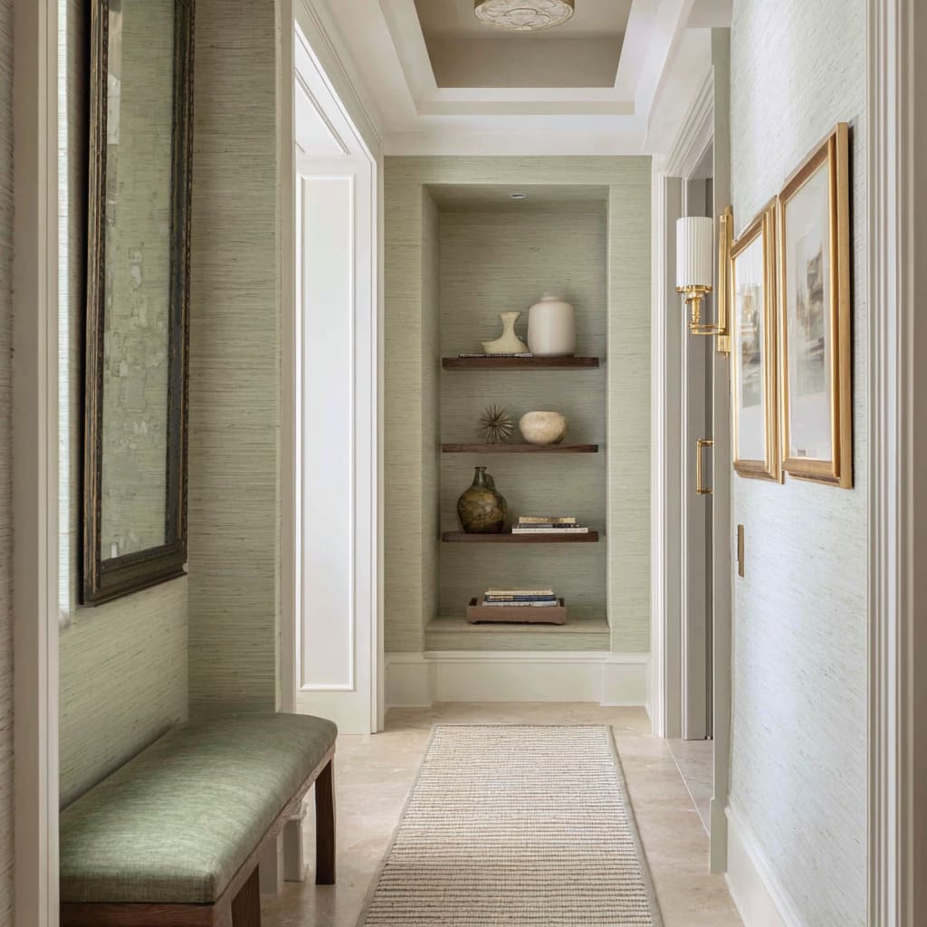 A hallway look achieves softness through sage-colored grasscloth wallpaper, wrapping the walls in fine horizontal fibers that shift in tone from pale olive