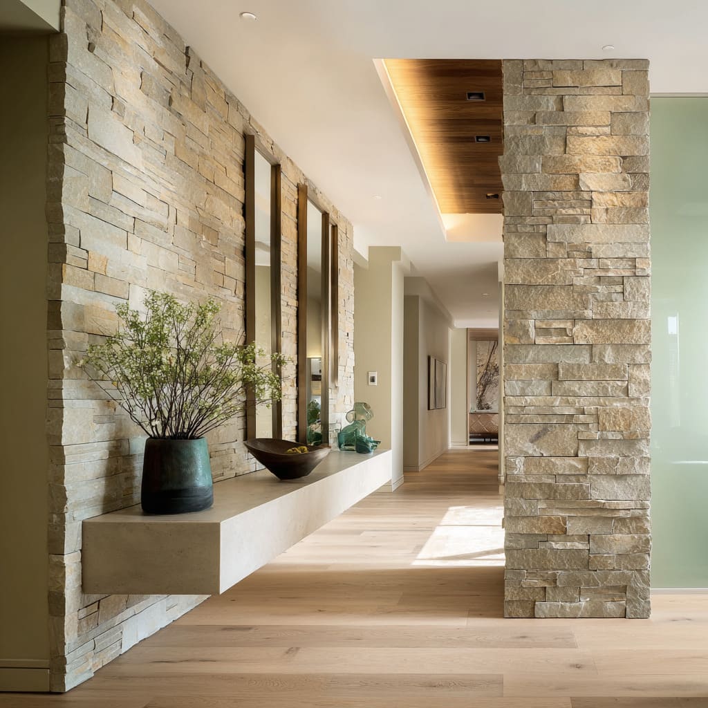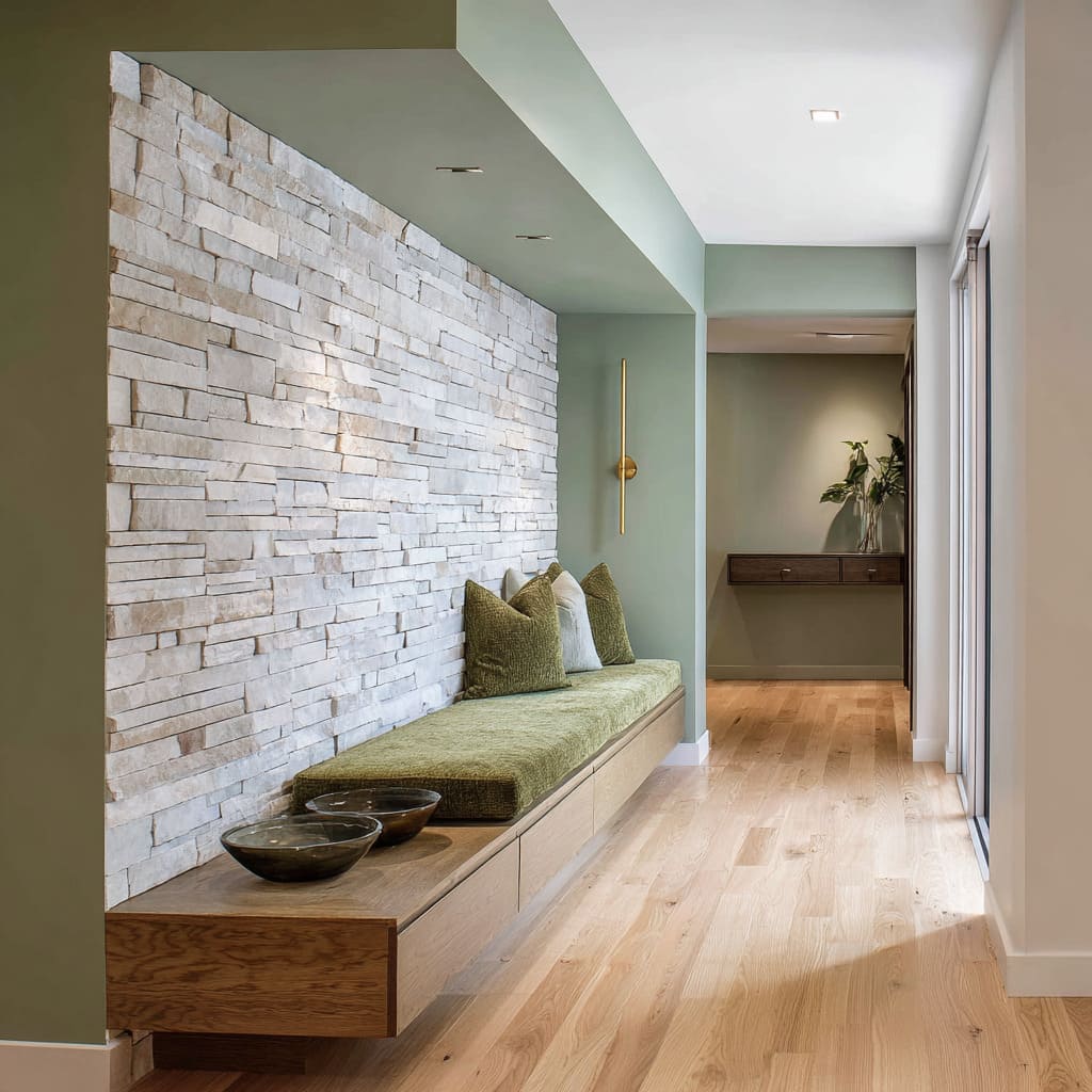 A large feature wall clad in irregular stone panels includes sections tinted with olive undertones