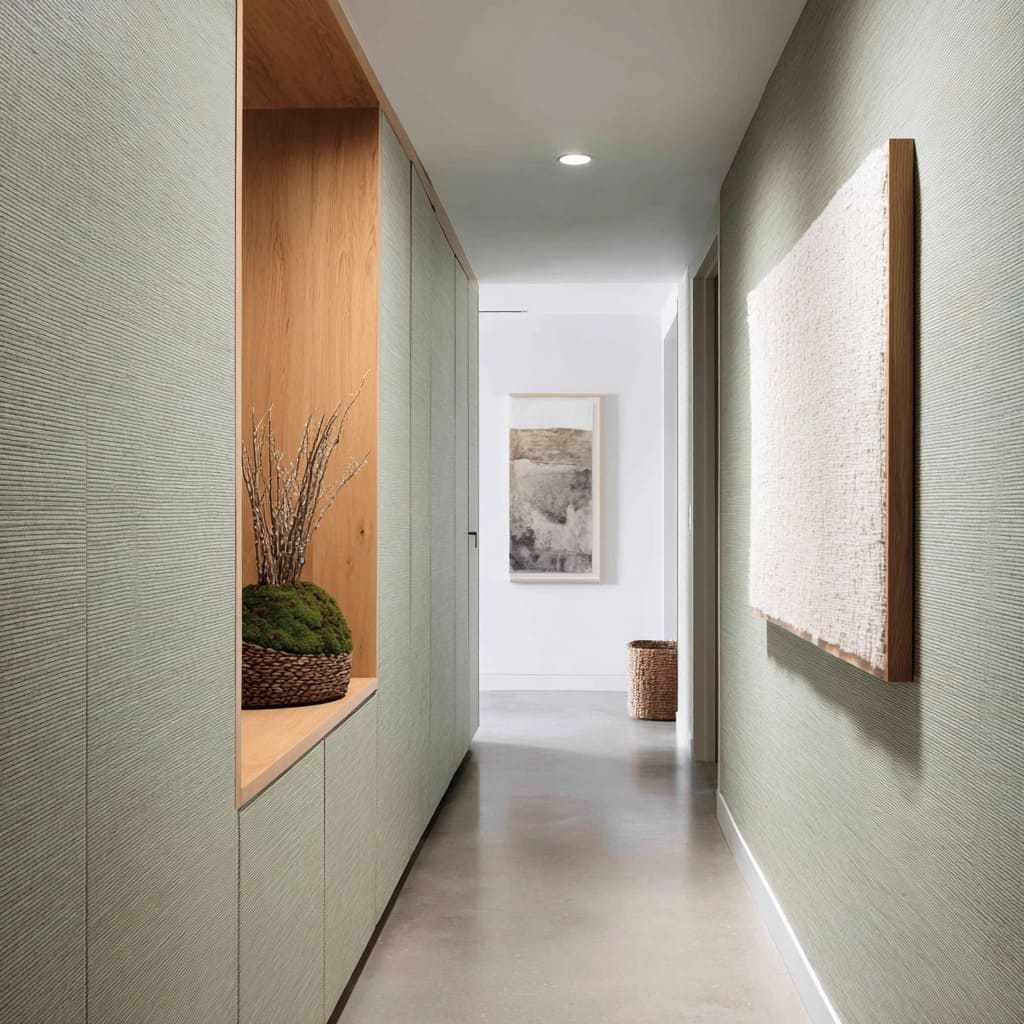 A minimalist hallway design uses green in a tone-on-tone layered way, achieved through soft sage-green wallcovering with visible horizontal weave texture