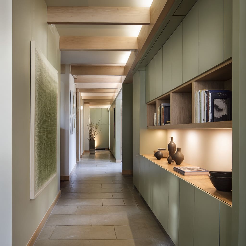 The entire passage feels composed, never visually cluttered or stagnant. In green hallway ideas that favor this tonal control, it’s the balance—not boldness—that maintains visual rhythm and harmony across every surface from floor to ceiling.