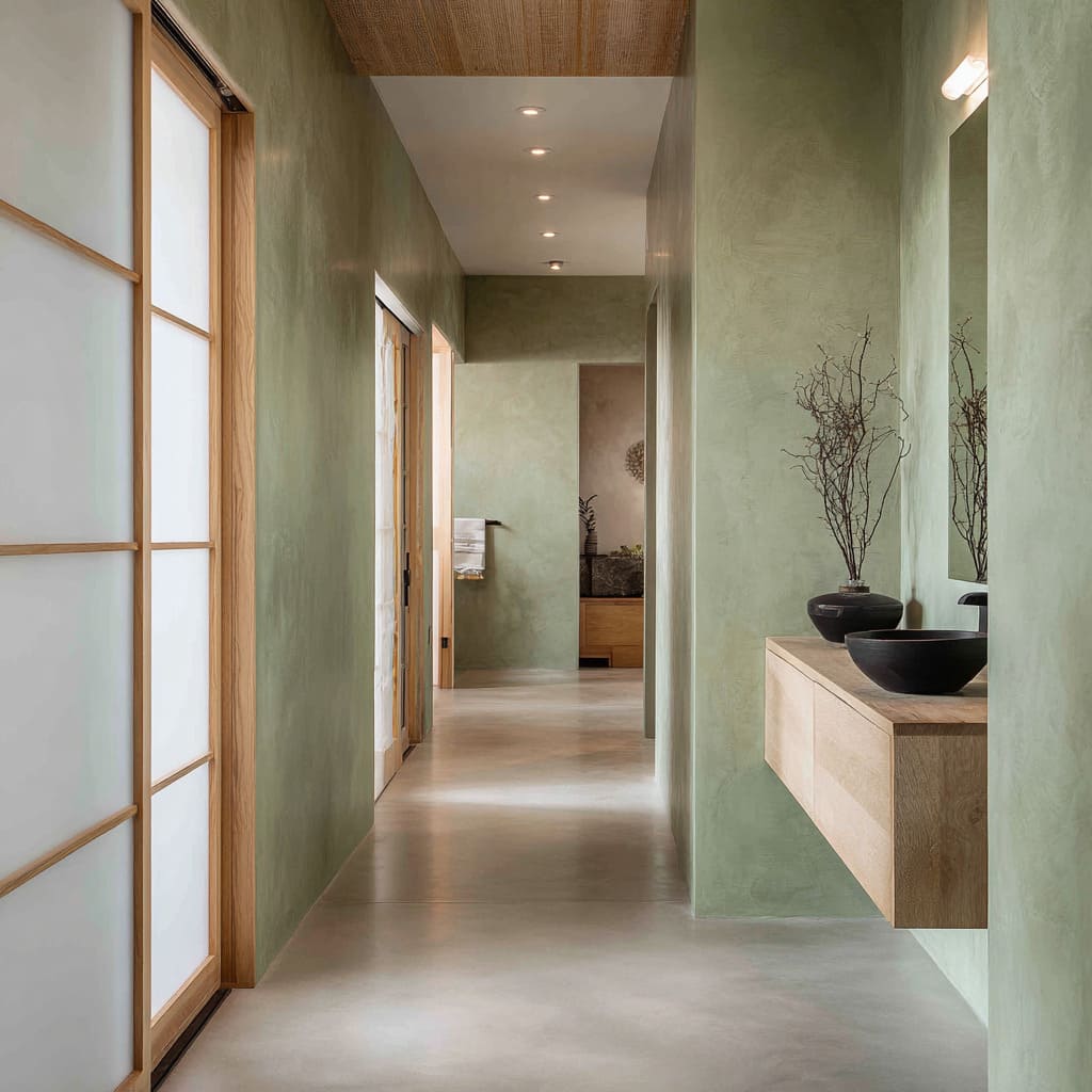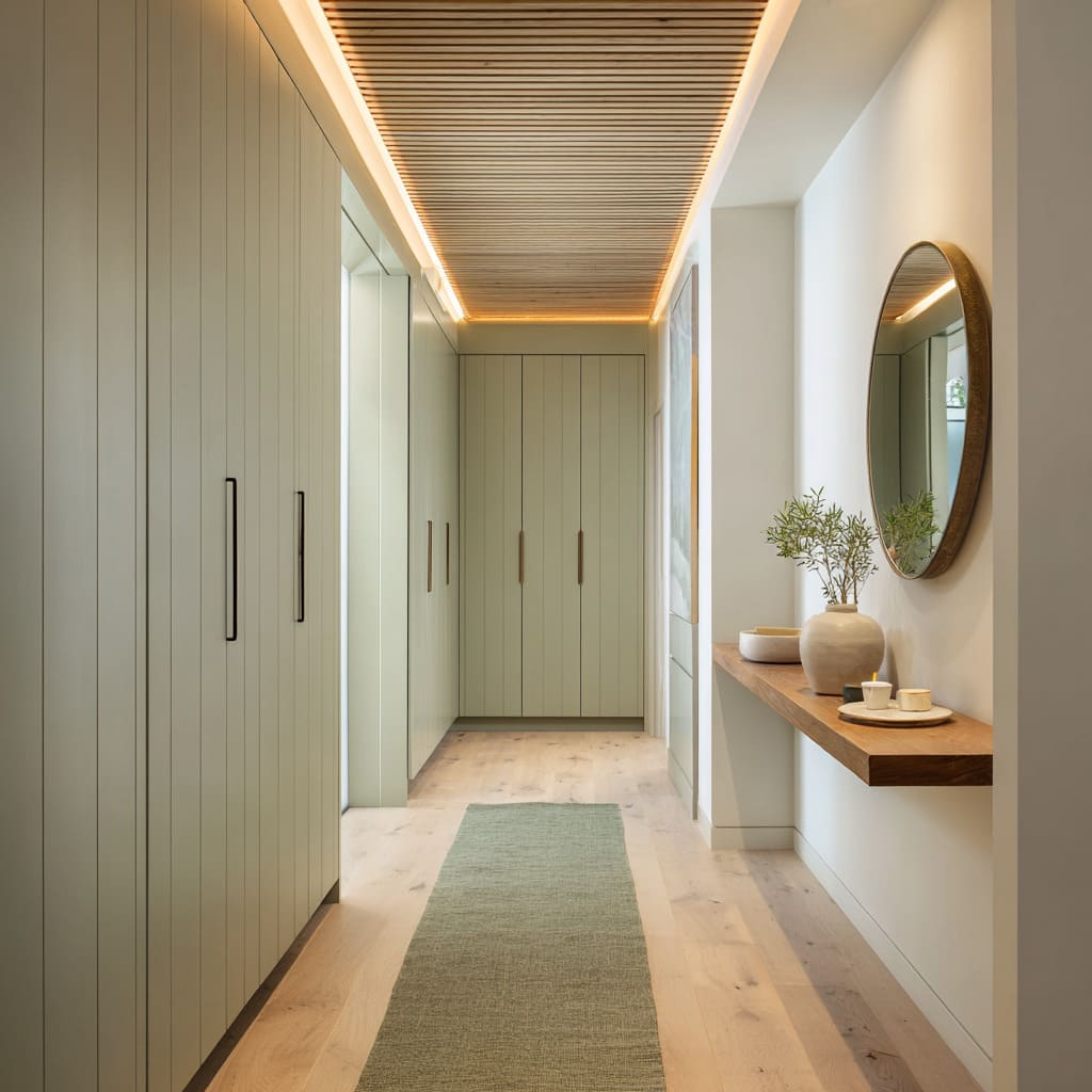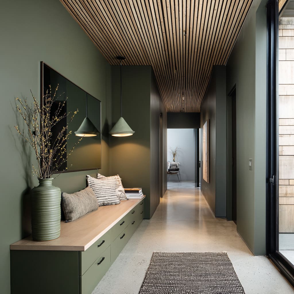 A hallway painted in dark moss along the sidewalls can visually push the ceiling upward, adding loft to narrow proportions. In contrast, pale sage on ceiling slats or panels subtly presses the space downward, producing a closeness that turns a corridor into a pause zone.