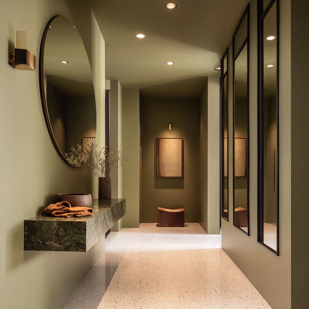 A narrow console in dark green marble or a recessed bench wrapped in deep sage velvet introduces density without shouting. These features slow the gaze, forming soft visual pauses.