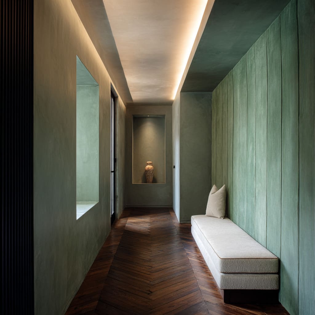 Even slatted wood stained in dusty mint delivers movement and softness. These subtle shifts in material reflect, absorb, or diffuse light at different rates, offering the eye something to trace along the corridor.