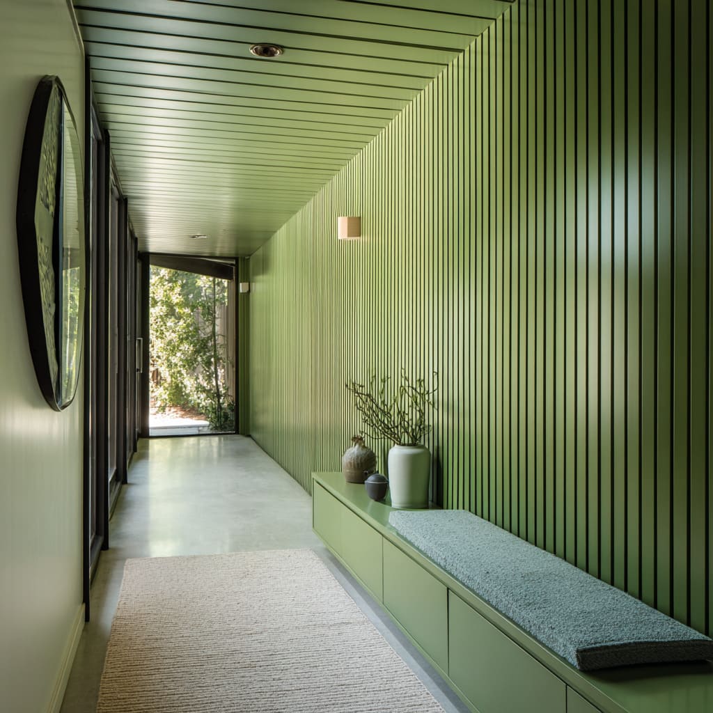 A moodier take on green, this hallway interior uses a deep moss tone across its walls and built-in bench drawers