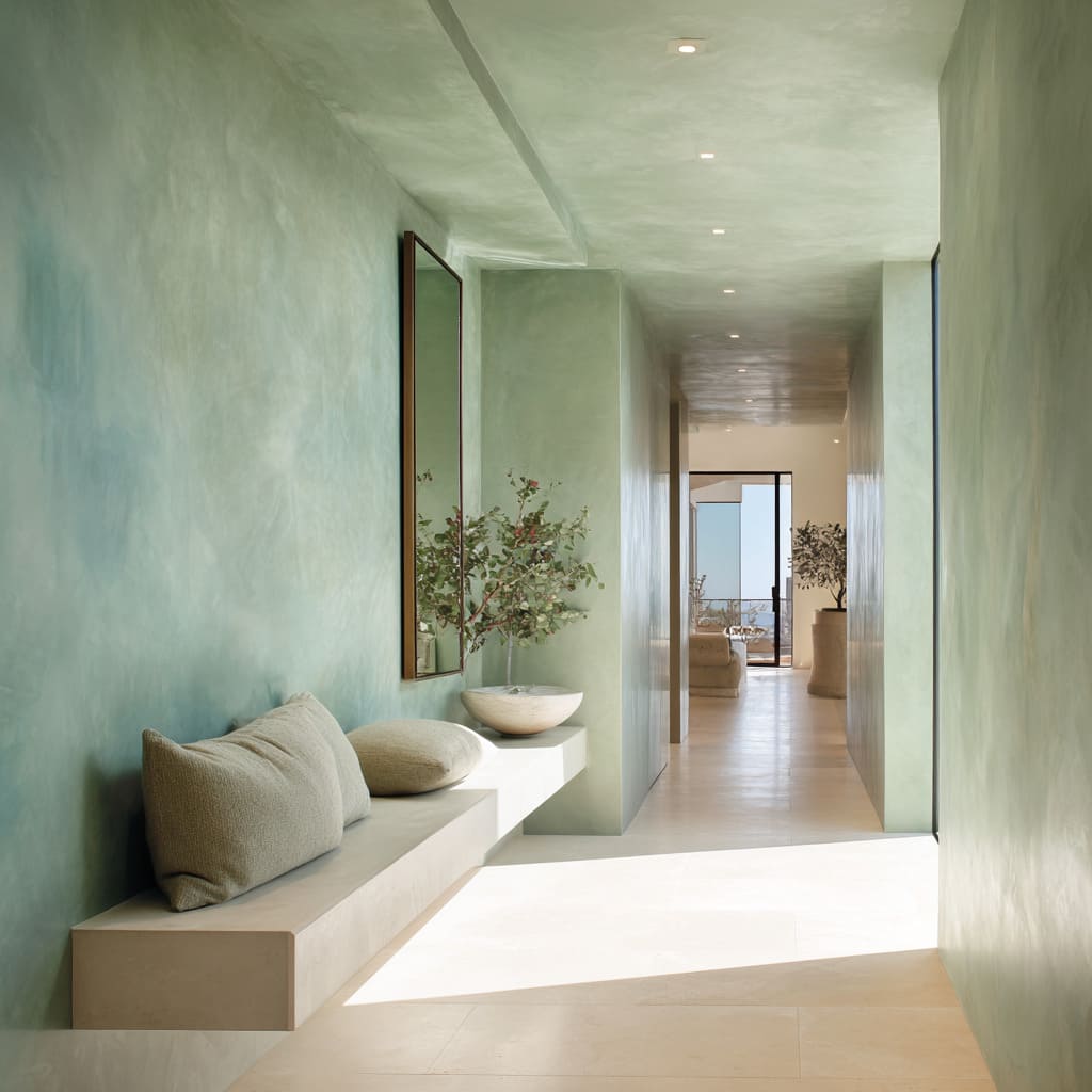 The plaster has a subtle, cloudy marbling effect that lets daylight shift its surface quality from dusty green to soft aqua depending on angle