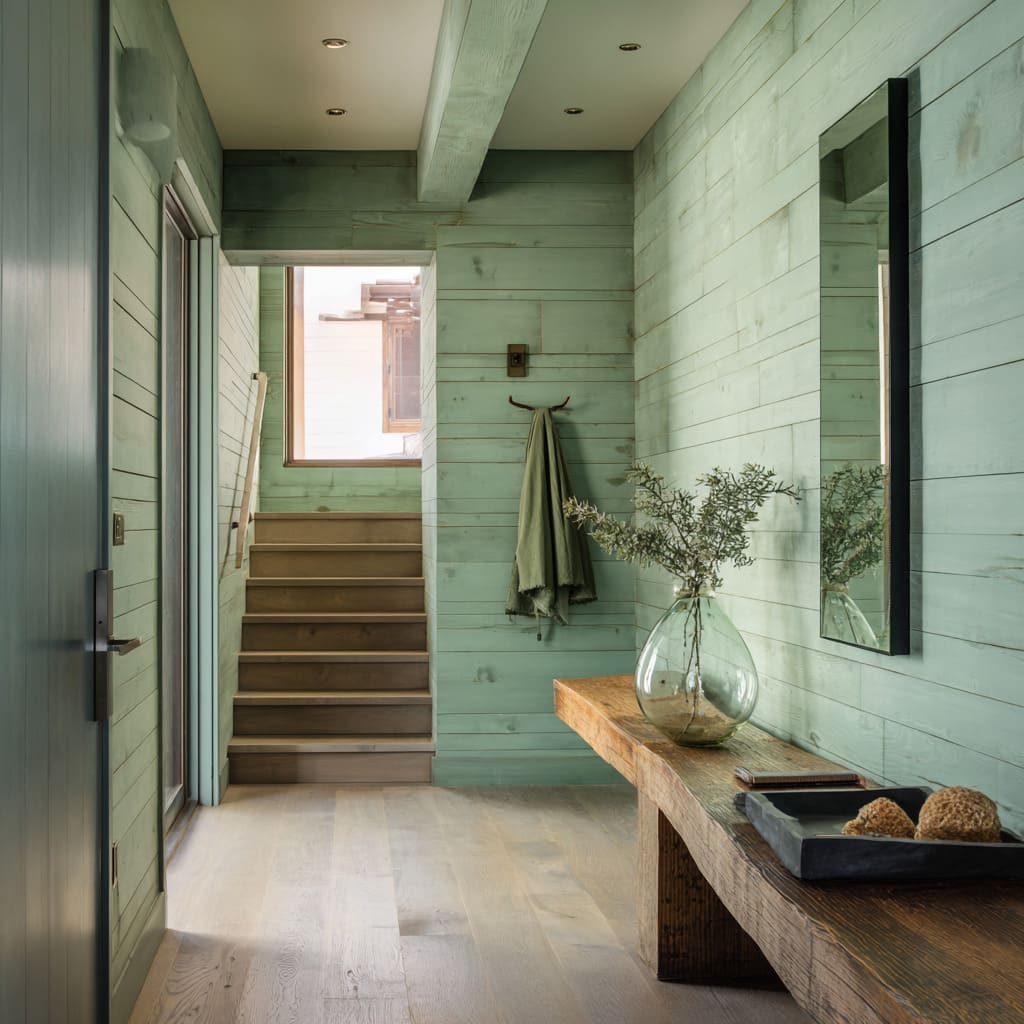 A fully clad in smooth vertical panels painted in a quiet soft sage hallway design