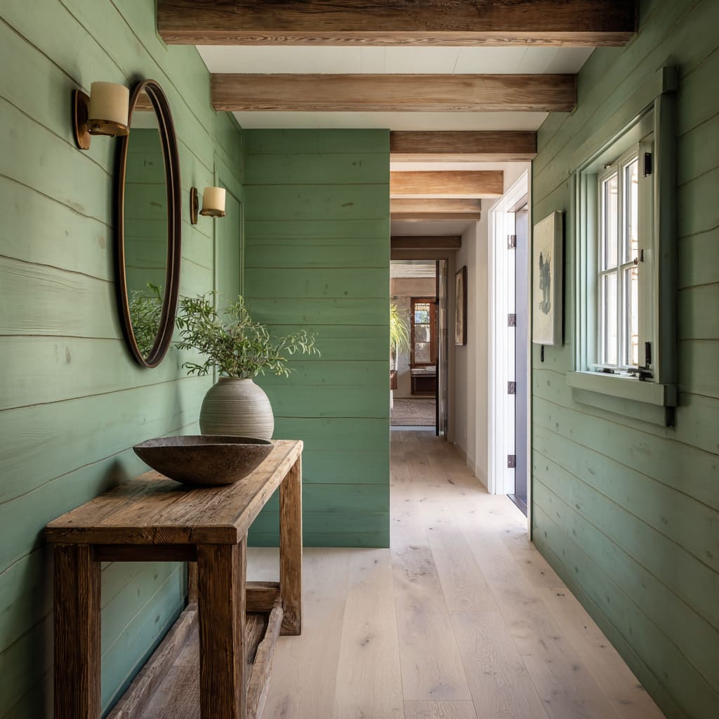 This hallway style features dusty sage-green shiplap planks running horizontally, creating a familiar yet upgraded rustic framework