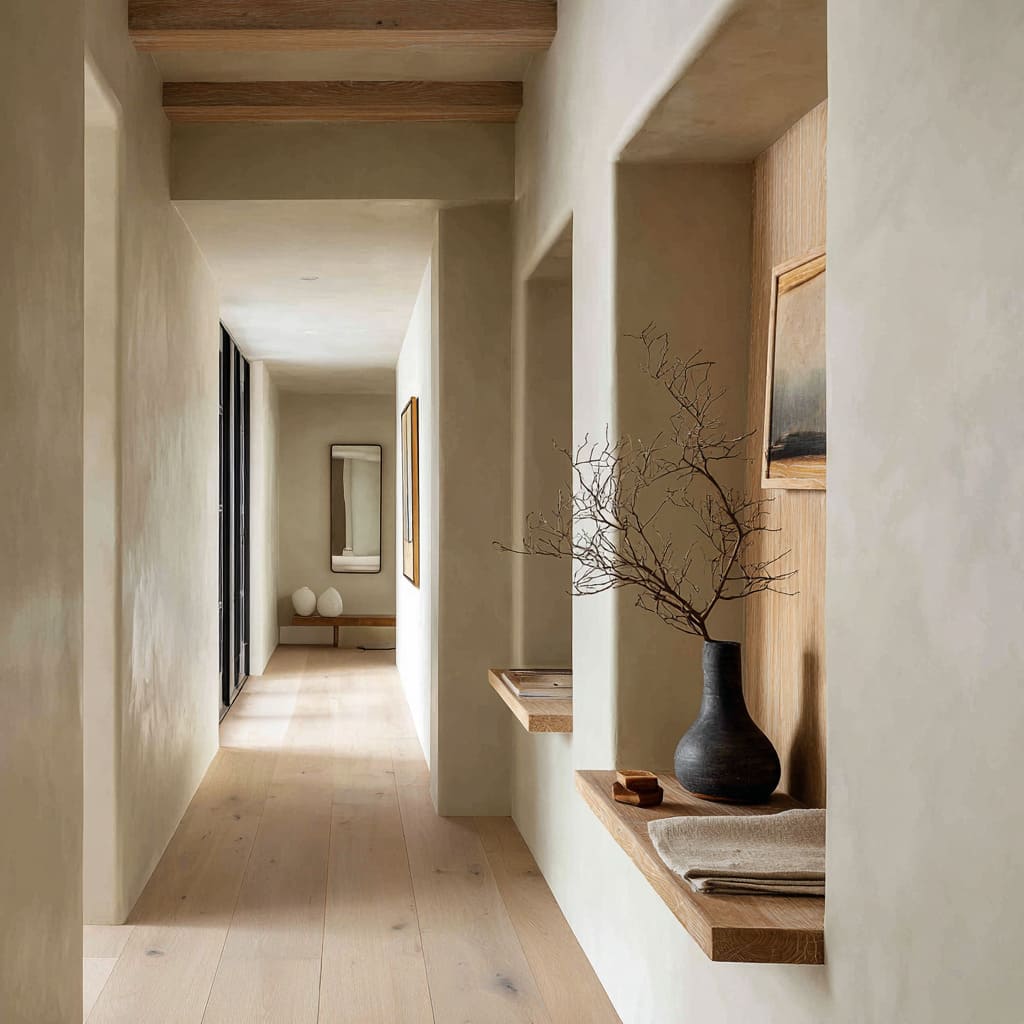 This is how a hallway holds interest without spectacle—through light, shadow, and surface, tuned to the same tone.