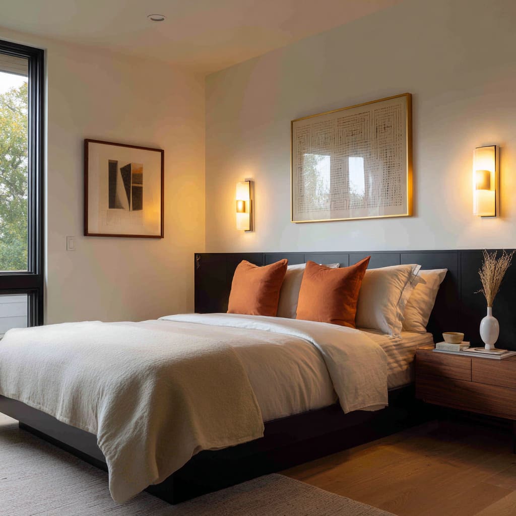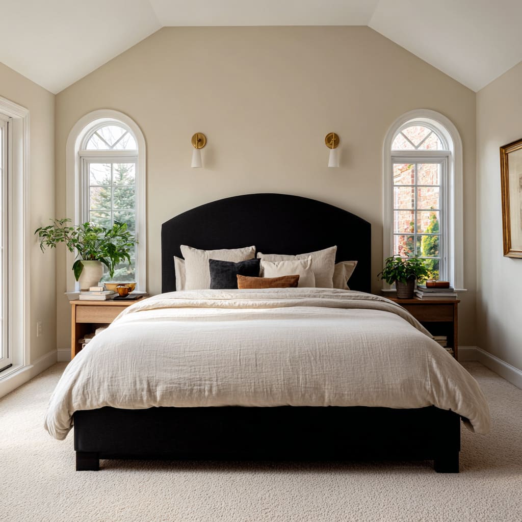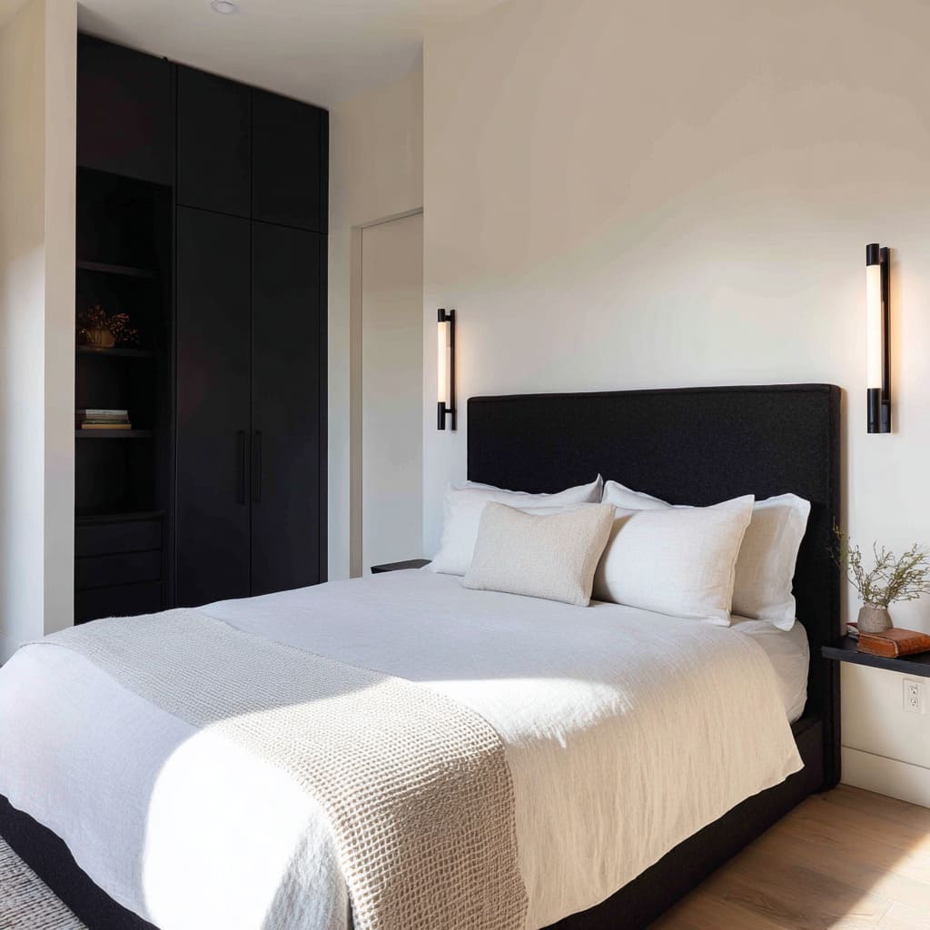 - The bright-frame anchor: pale walls + bright bedding + black headboard as a clean silhouette, with one thin dark line repeated somewhere else (window trim, art frame, sconce arm) so the black reads like part of the room’s outline.