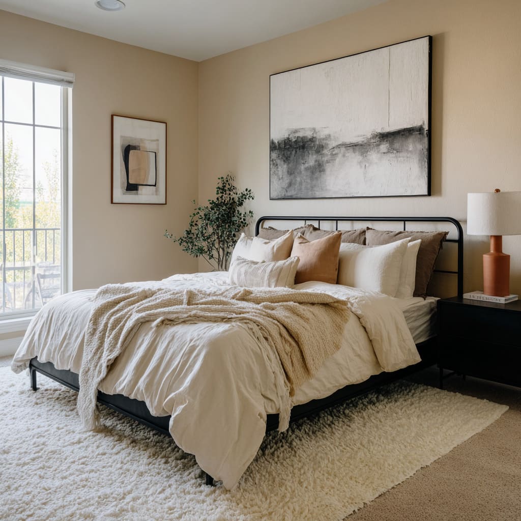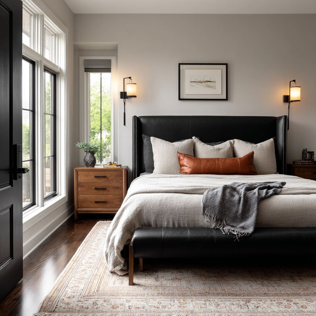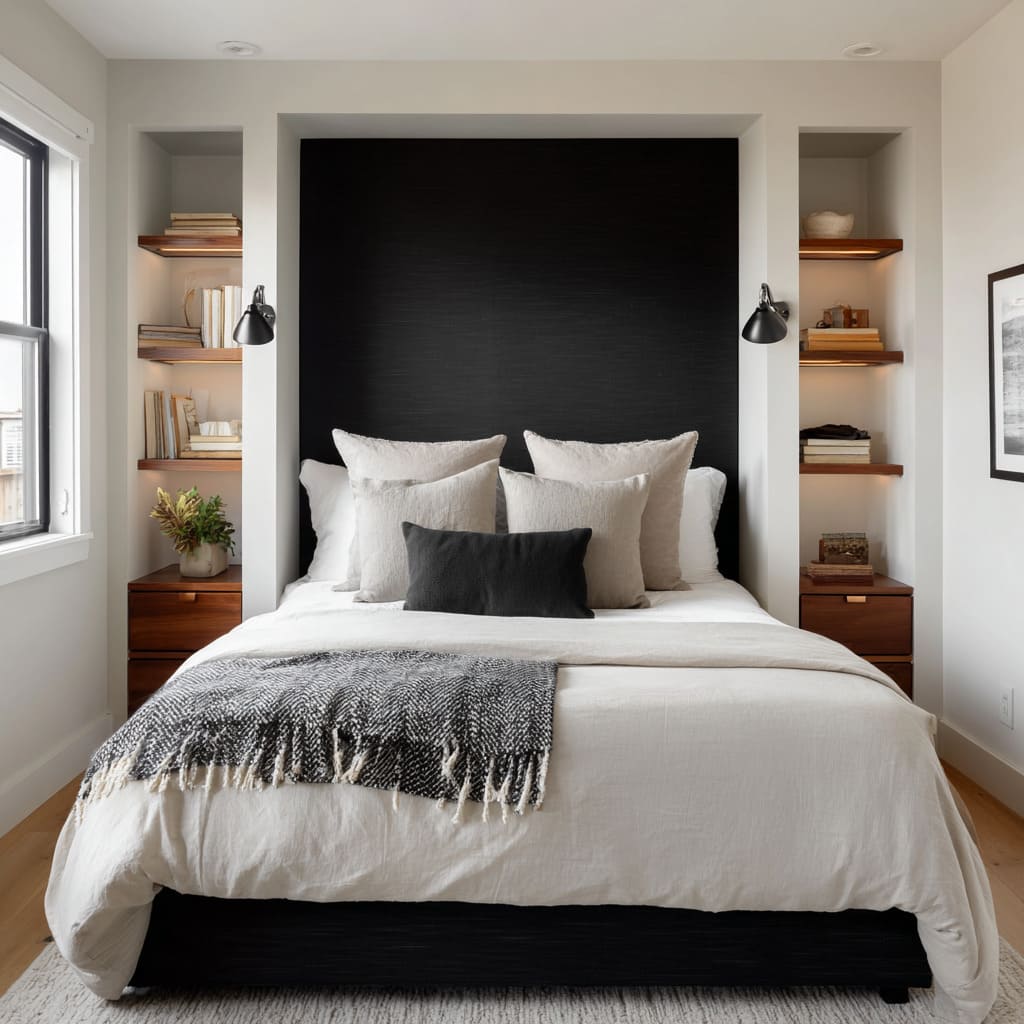 - The bright-frame anchor: pale walls + bright bedding + black headboard as a clean silhouette, with one thin dark line repeated somewhere else (window trim, art frame, sconce arm) so the black reads like part of the room’s outline.