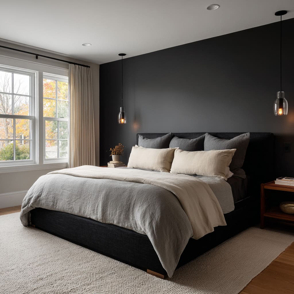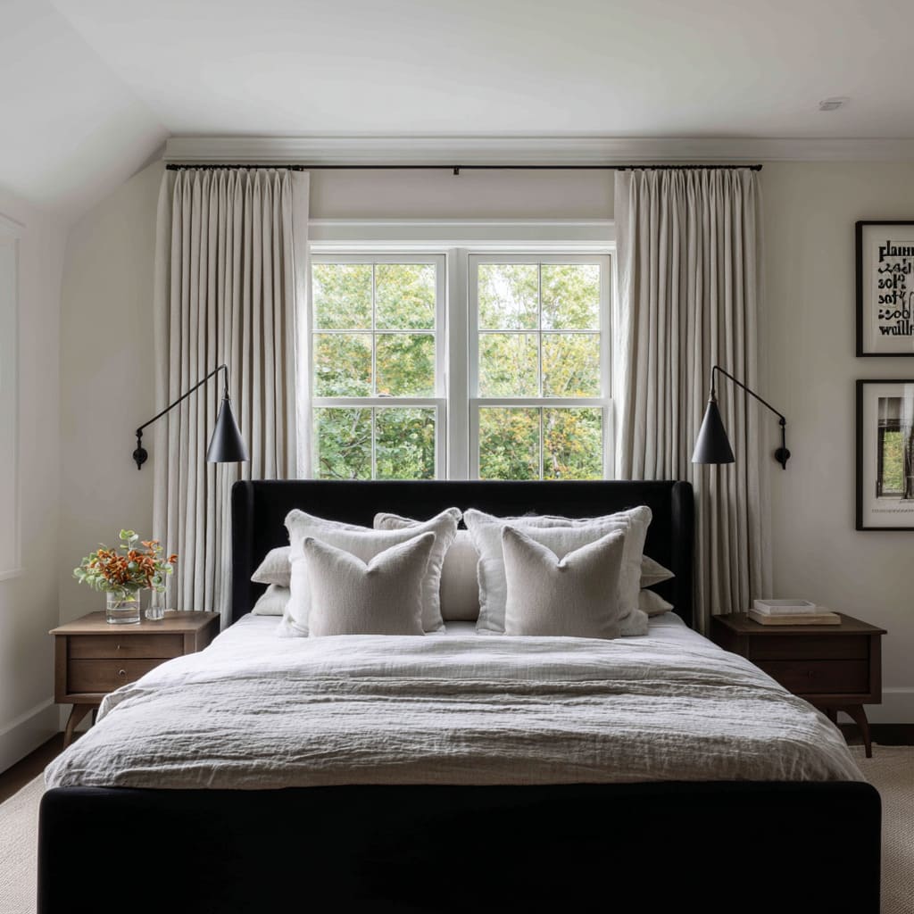 A dark headboard can carry weight on one side of the room while daylight and negative space carry weight on the other. A tall black-trim window can counterbalance a darker bed wall.