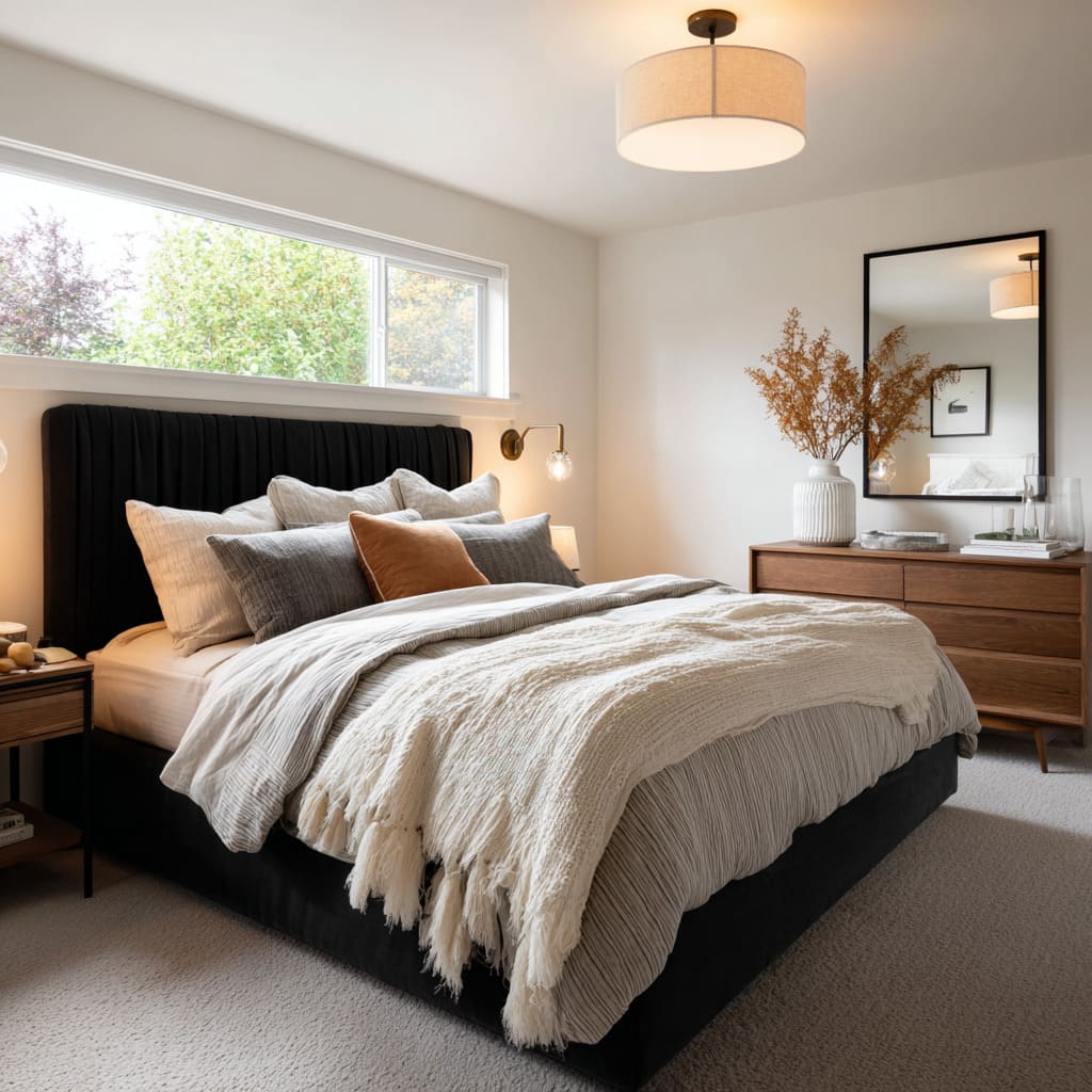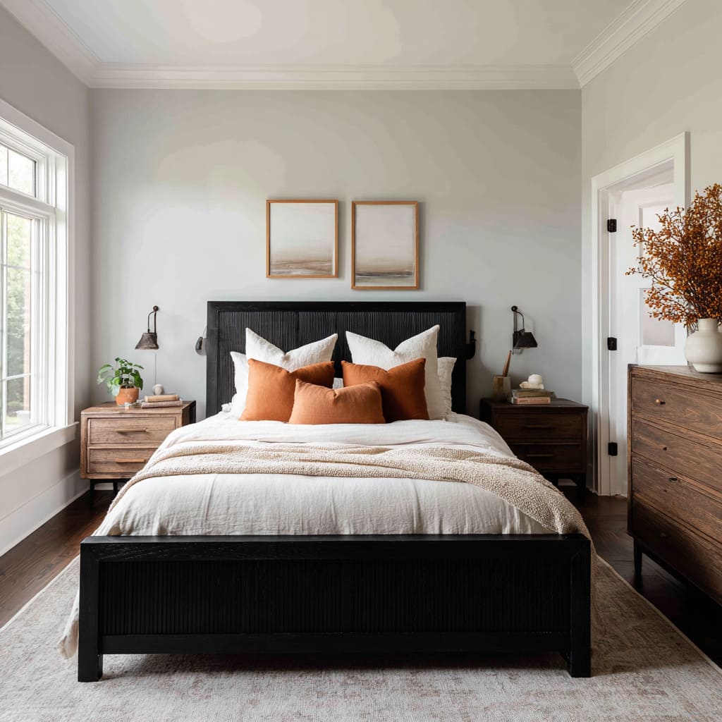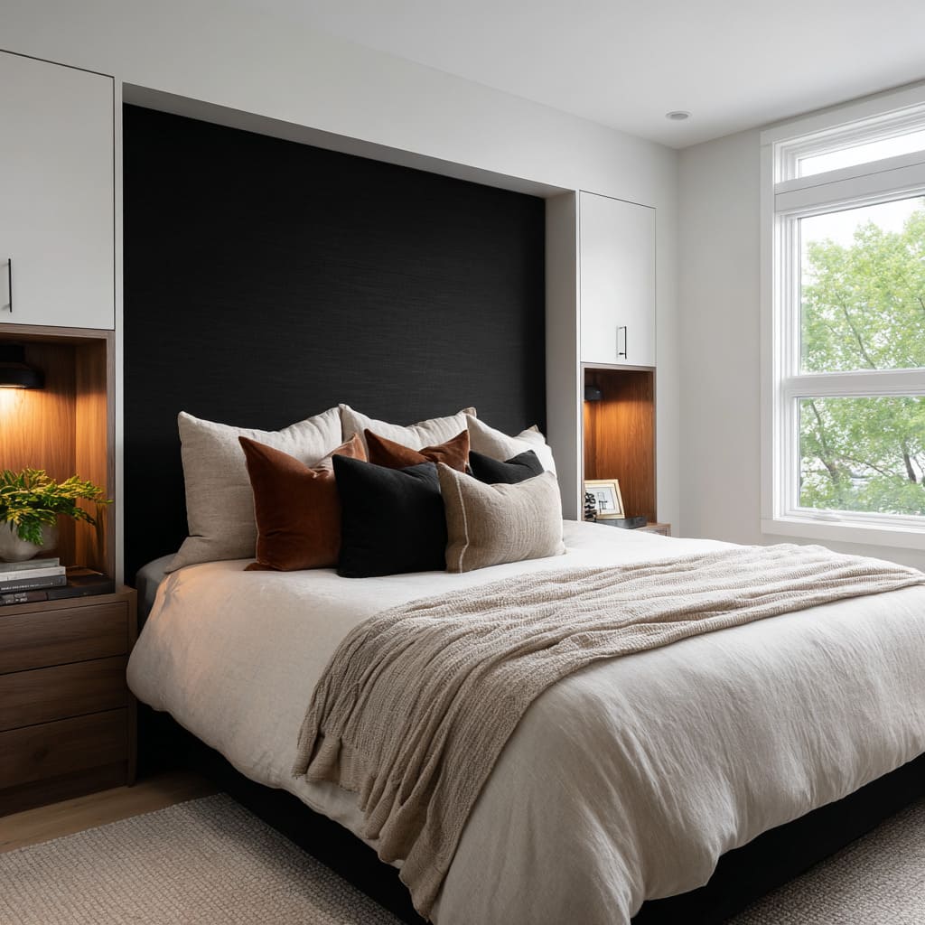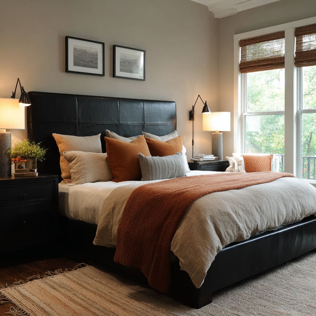 That’s why a dark headboard pairs so well with warm rust accents: the warm note adds comfort, black adds order, and light bedding keeps the room open. In many strong bedroom ideas with a black headboard, the emotional result is not dramatic.
