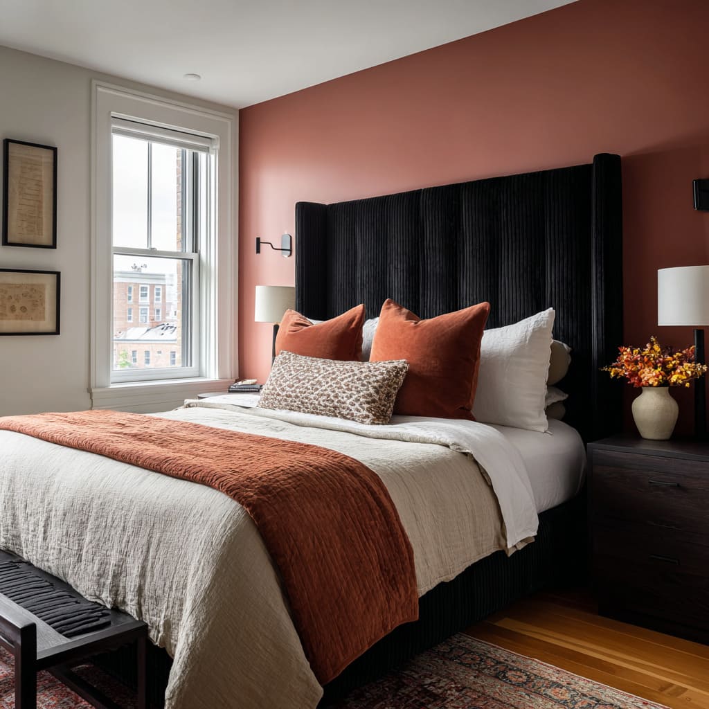 - The bold-wall stabilizer: a colored wall (clay, terracotta, muted rust) carries mood, and the black headboard acts like a stabilizing border that keeps the color from feeling noisy.