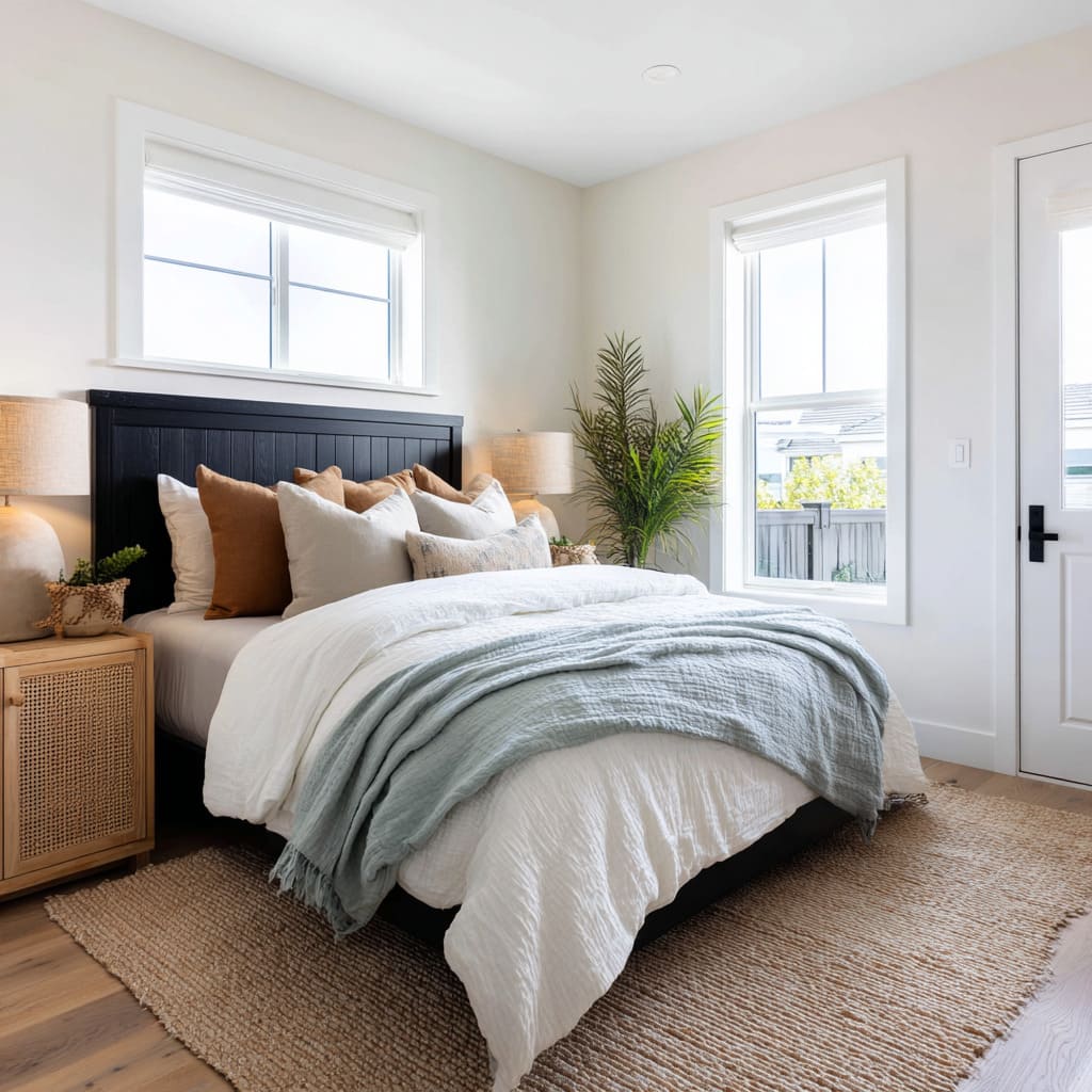 - The coastal black: black headboard plus airy light bedding and pale floor/rug, with small black repeats that keep the room from feeling washed out; warmth comes from sand tones and soft textures, not from more objects.