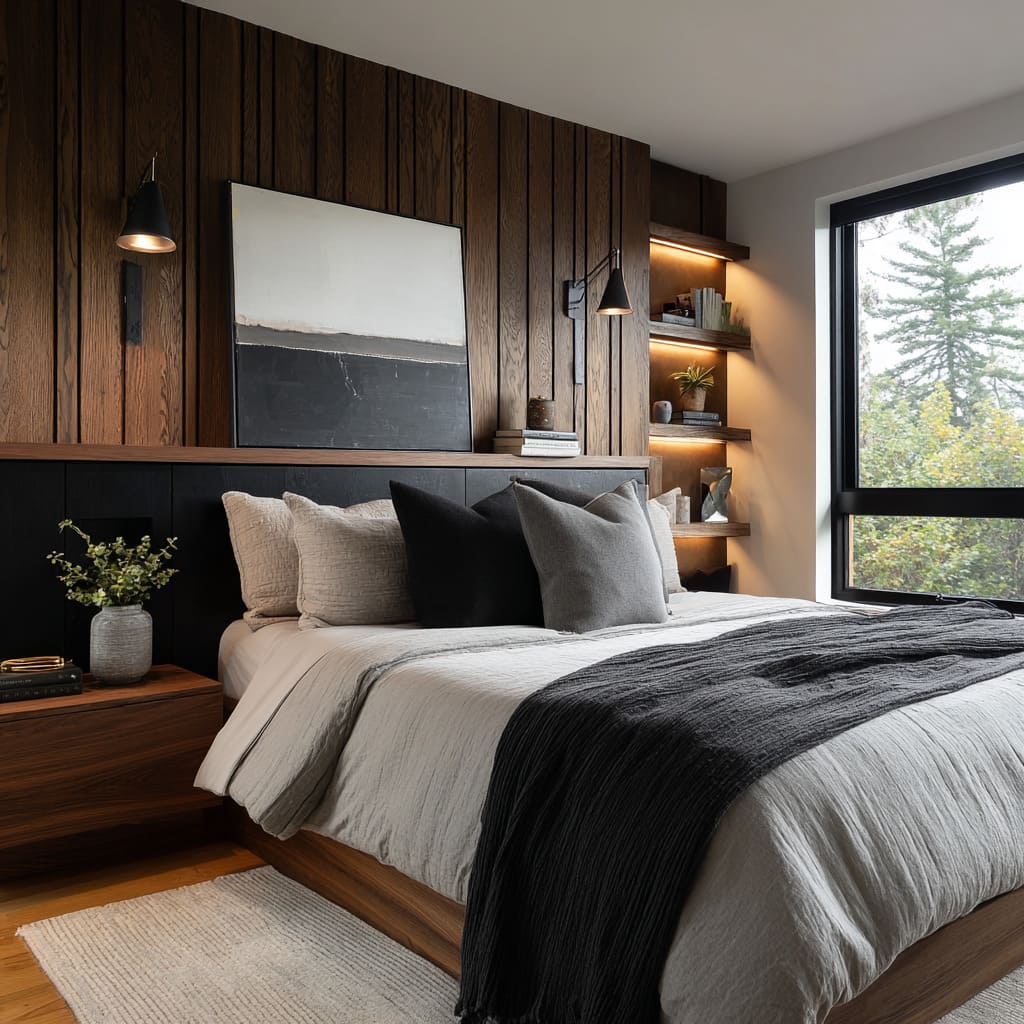 - The soft shadow bed wall: black headboard on a slightly warm wall tone, with matte textiles and gentle wall lighting that creates gradients; the whole bed zone feels like shadow control rather than contrast drama.