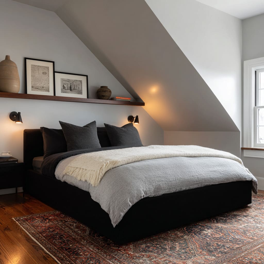 - The tall-wall horizon fix: black headboard creates a horizontal boundary that makes high walls feel finished; the rest of the wall stays calm so the eye reads structure, not emptiness.