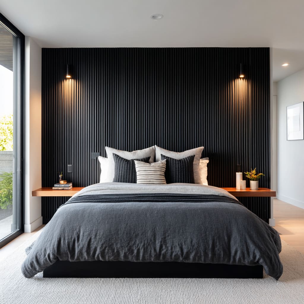 - The textured-black calm: the headboard surface carries the interest (channels, ribs, micro texture), while art and accessories stay quiet; the wall becomes a background and the headboard becomes the only “pattern.”