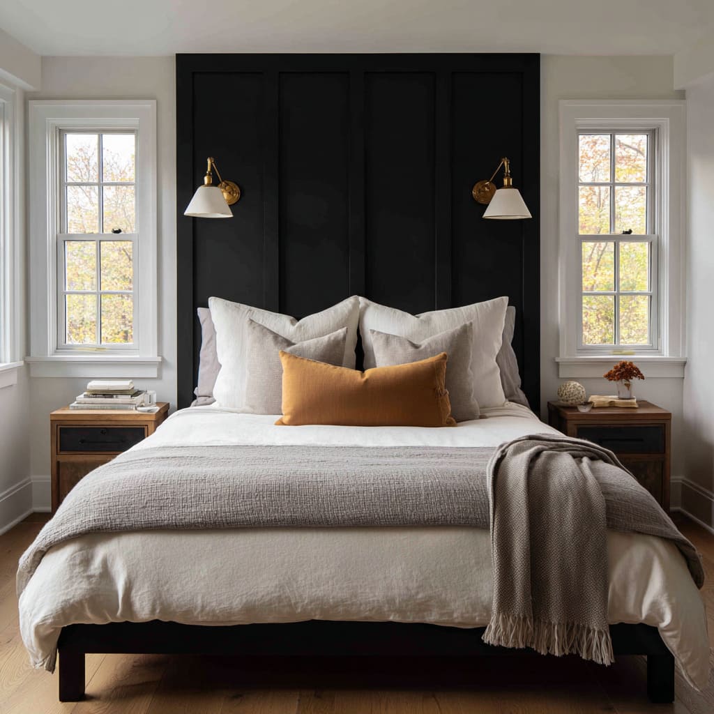 - Mid-tone walls (soft clay, muted taupe, smoky mushroom) can make black feel integrated rather than contrasted; the headboard becomes the darkest note, but not the only dark note.