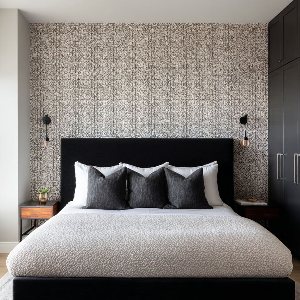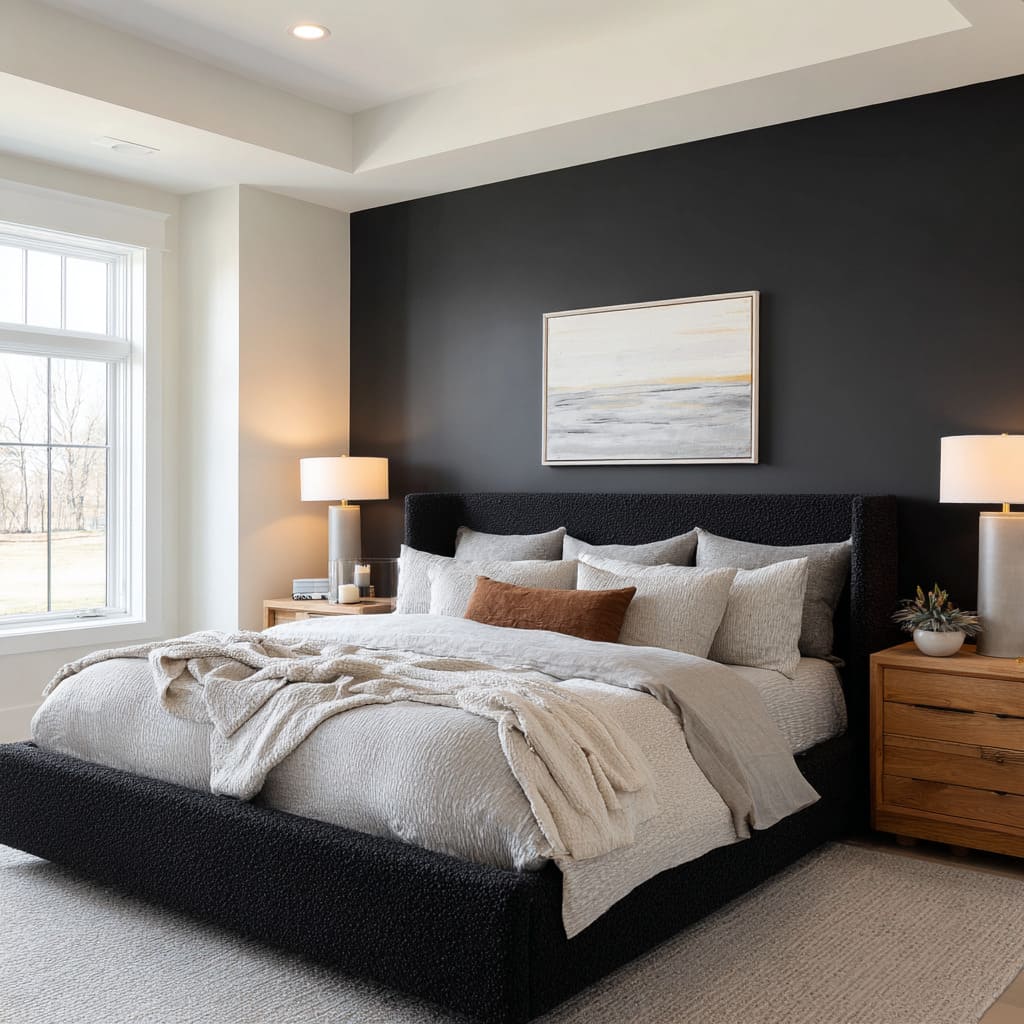 Taken together, black works best when it is treated as structure, supported by soft textures, warm light, and a clear value ladder. It’s less about adding objects and more about making the existing surfaces—wall, bedding, wood, light—behave in a coordinated way.