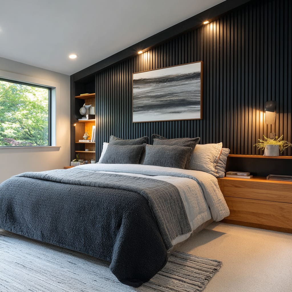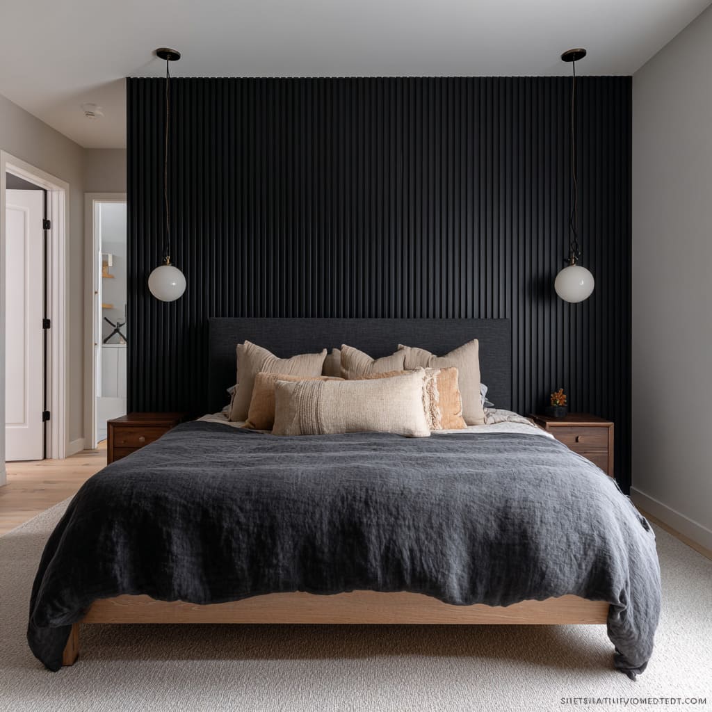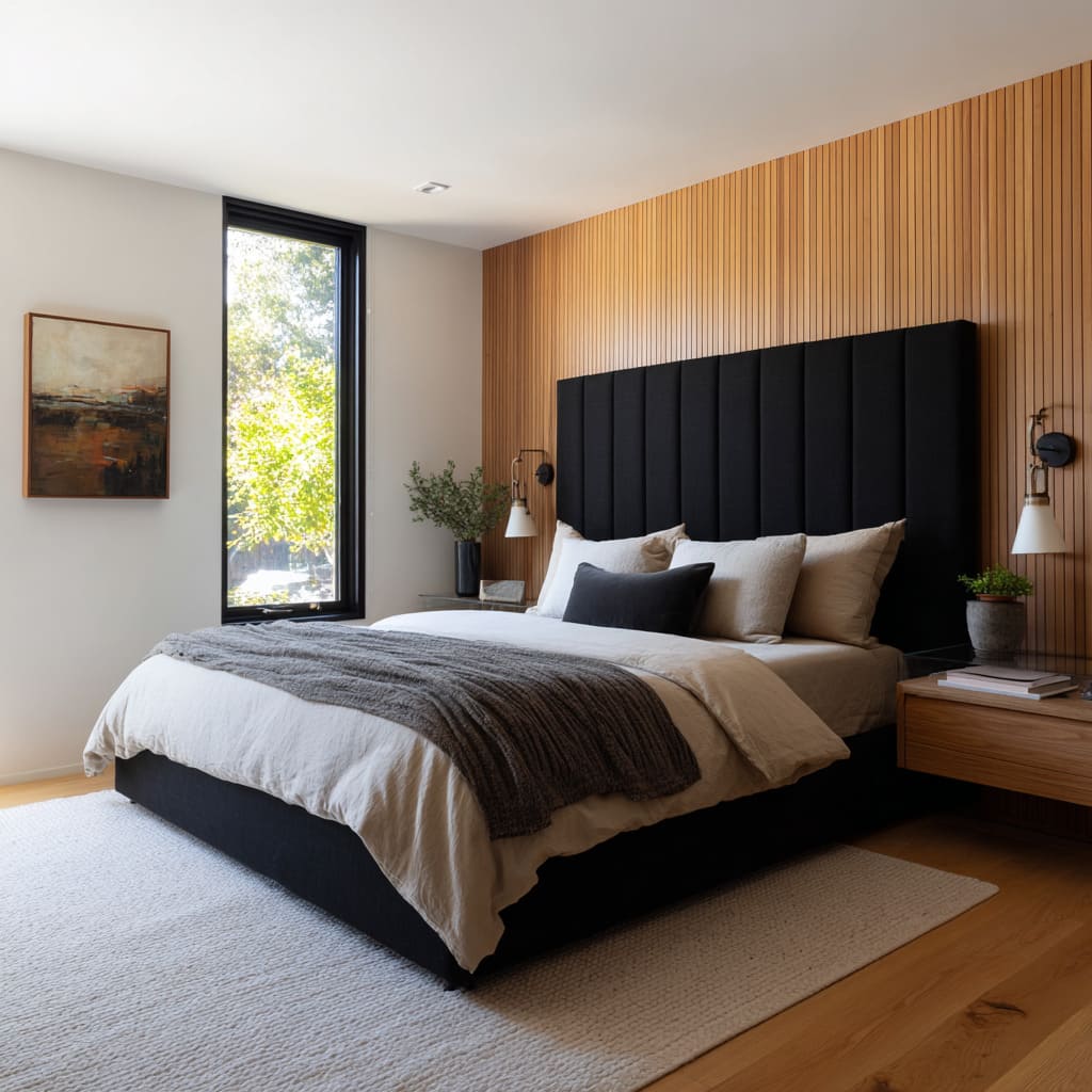 A strong approach is to let wood carry the larger field (a slatted wall, wide nightstands, a dresser), then keep black concentrated in the bed zone. When black spreads too widely—headboard, dresser, nightstands, frames, lamps, plus dark bedding—the interior design can start feeling compressed.