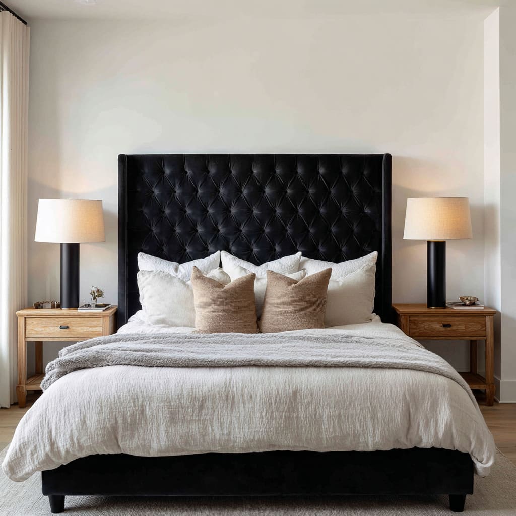 When wood carries the warmth and volume, black can stay calm and clean. Warm wood nightstands next to dark headboards are doing temperature work: the wood softens the black edge where your eye naturally rests (right around the pillows and lamps).