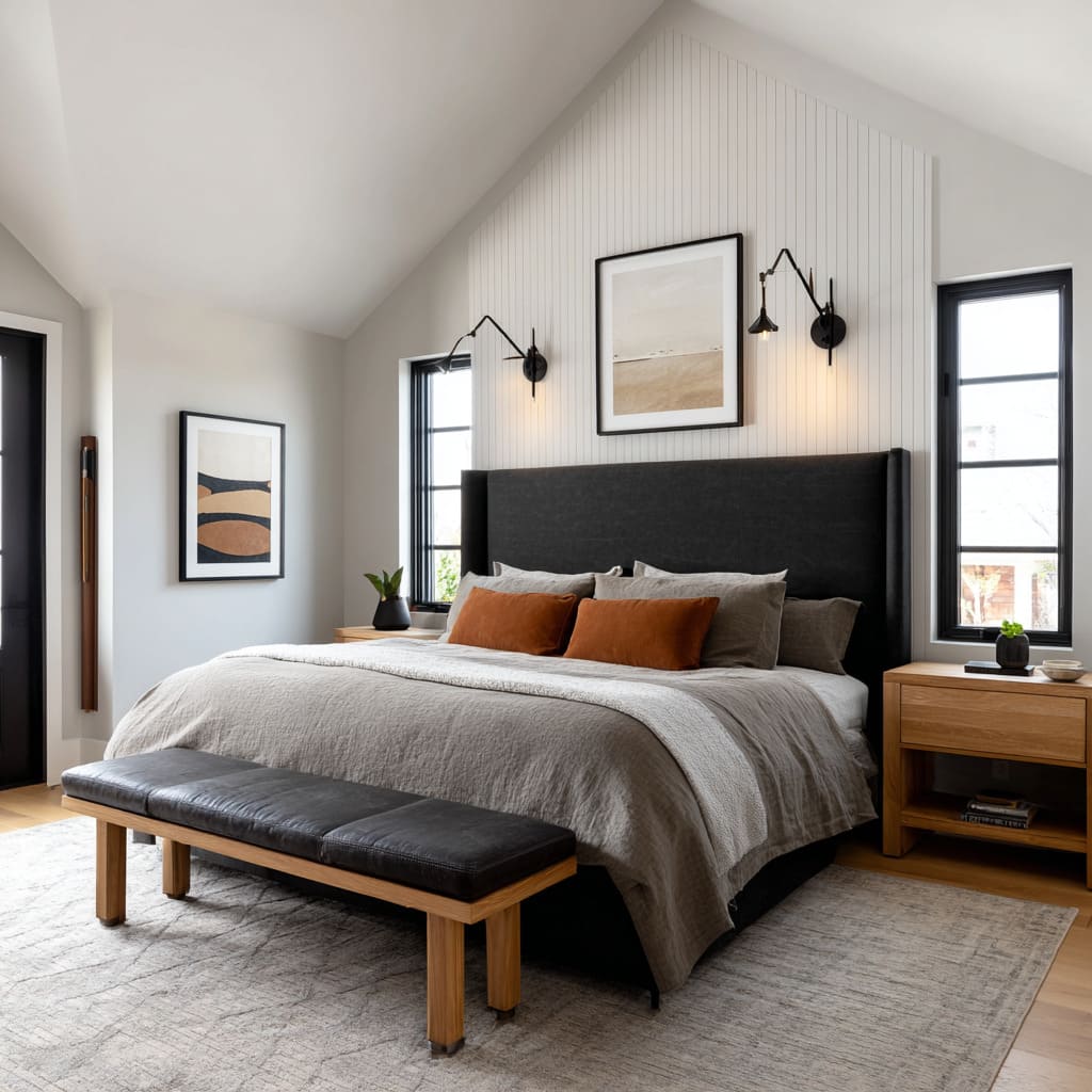 - Built-in feel without literal built-ins: matching dark elements (sconces, trim, bench) that make the bed feel anchored to the room’s structure.