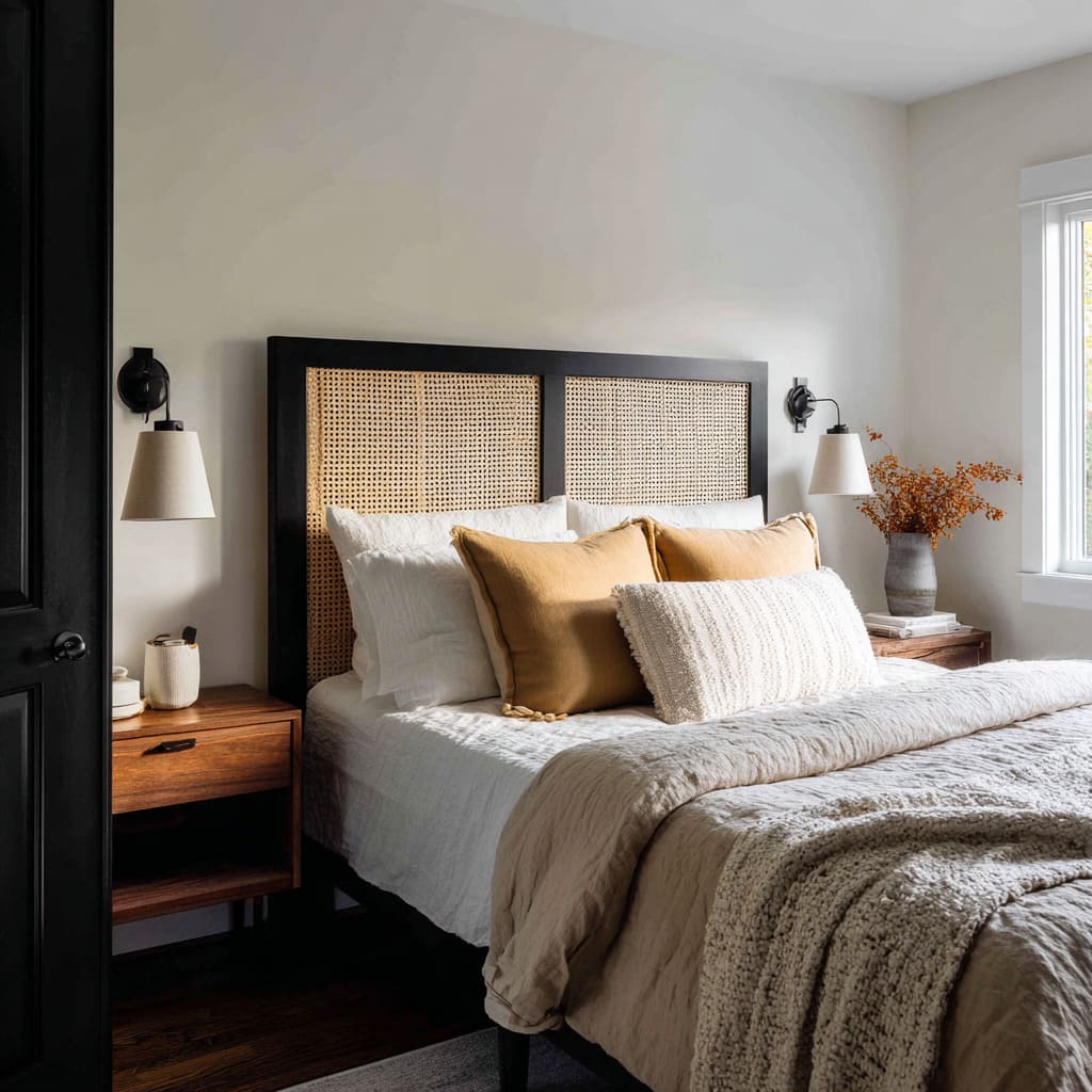 A black frame with a lighter woven center is a smart way to keep black present but breathable. The eye reads the black outline as structure, while the woven center prevents the bed from becoming a solid dark slab.