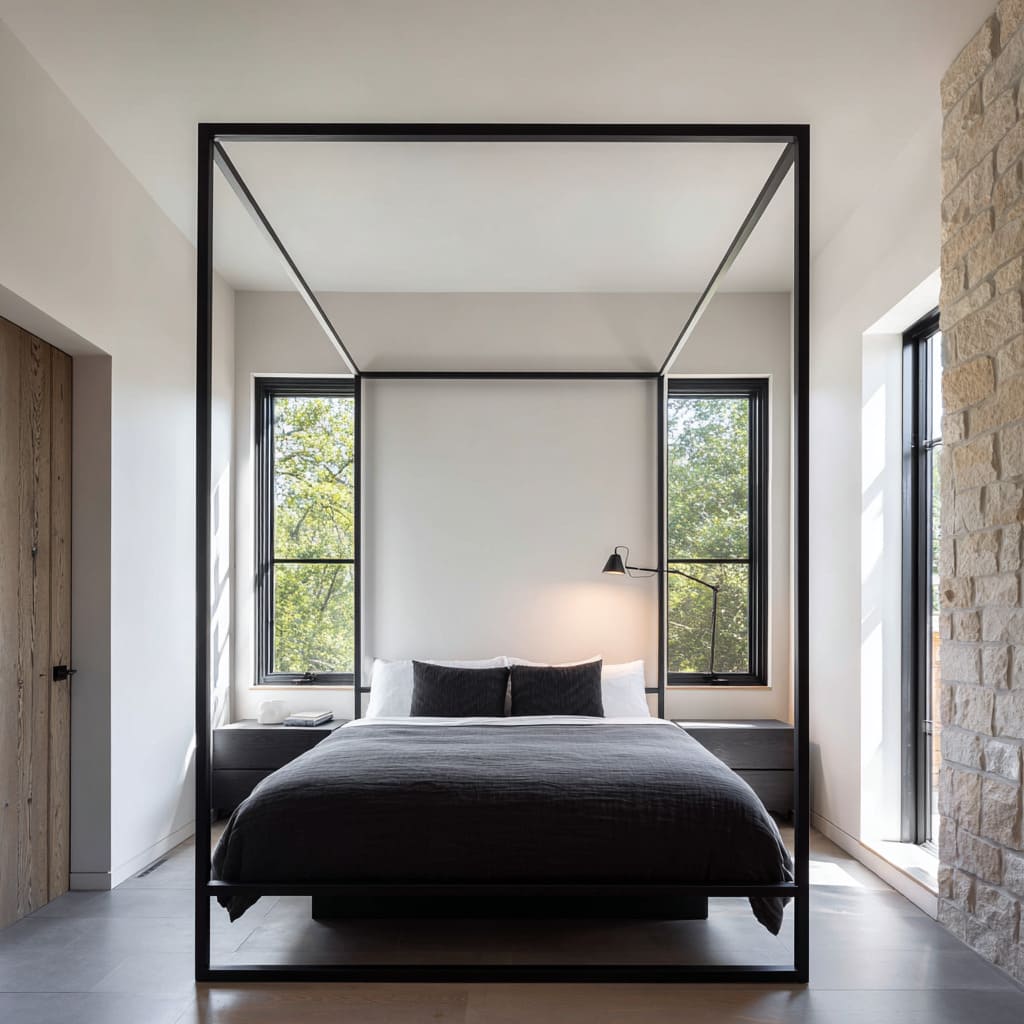 - The “thin black” system: the headboard is the main black mass, but everything else is thin—slim frames, narrow sconce arms, narrow window lines—so black reads precise, not heavy.