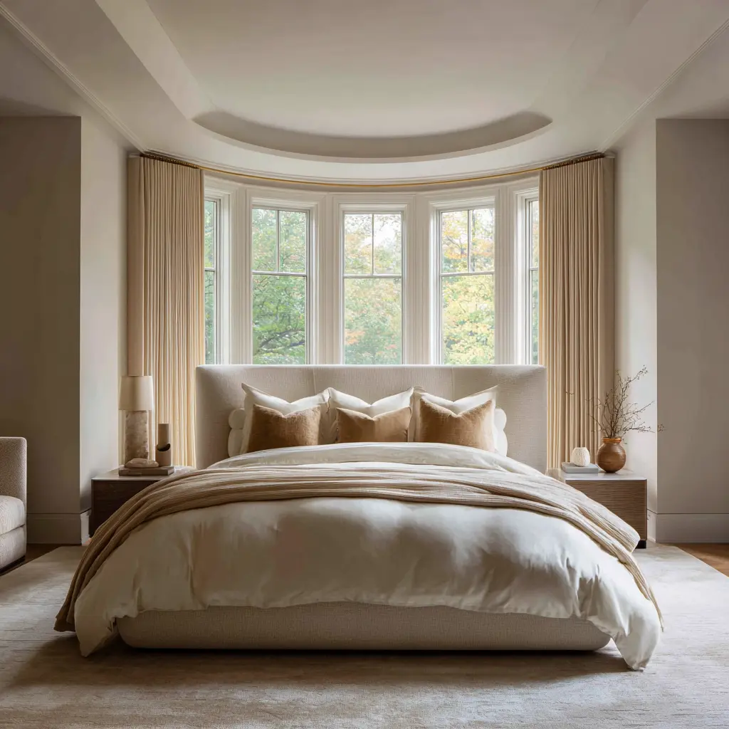 If it is too enclosed, it feels heavy. The interior design solution can find the middle point through moves like full-height drapery around large windows, low beds beneath tall walls, soft vaulted ceilings, and bed walls that feel gently framed rather than flat and empty.