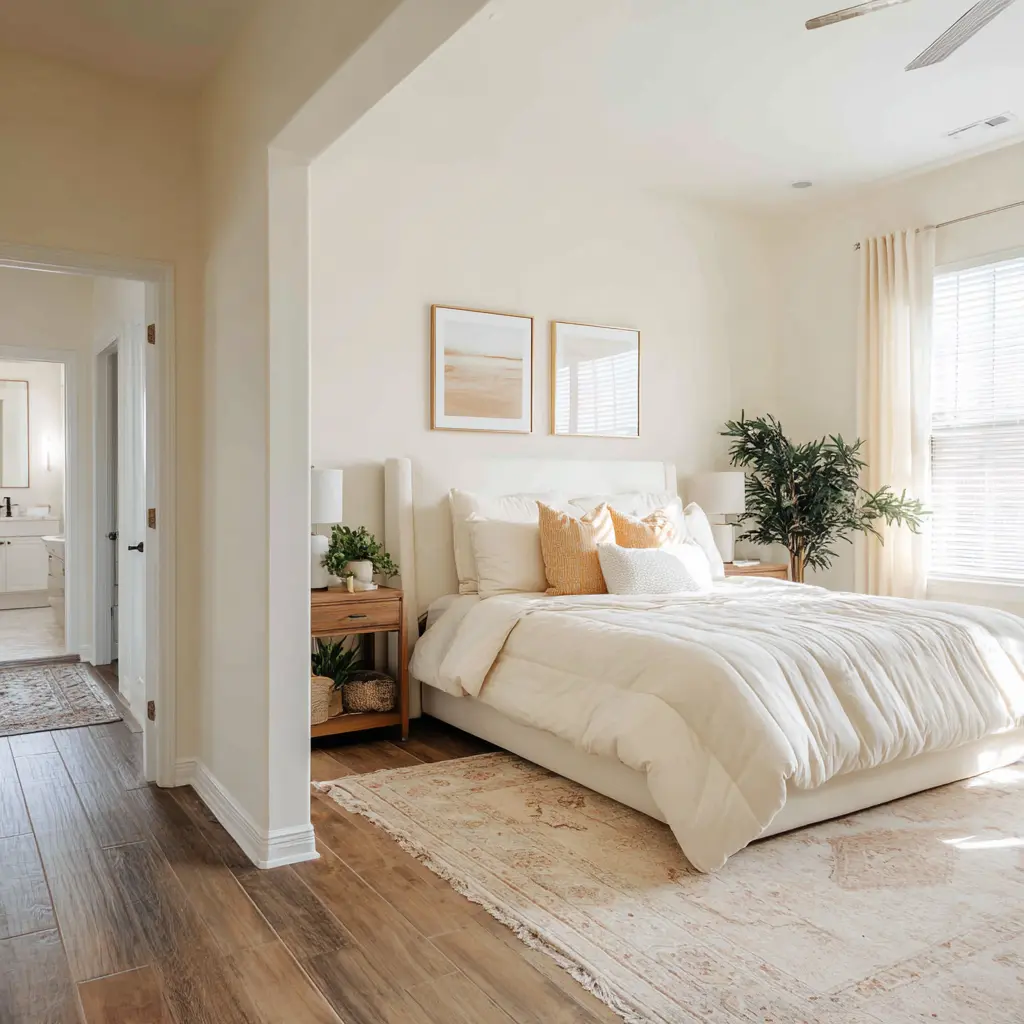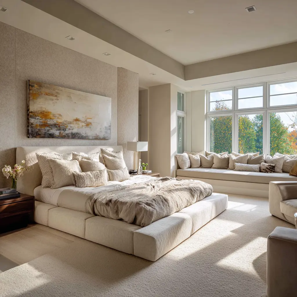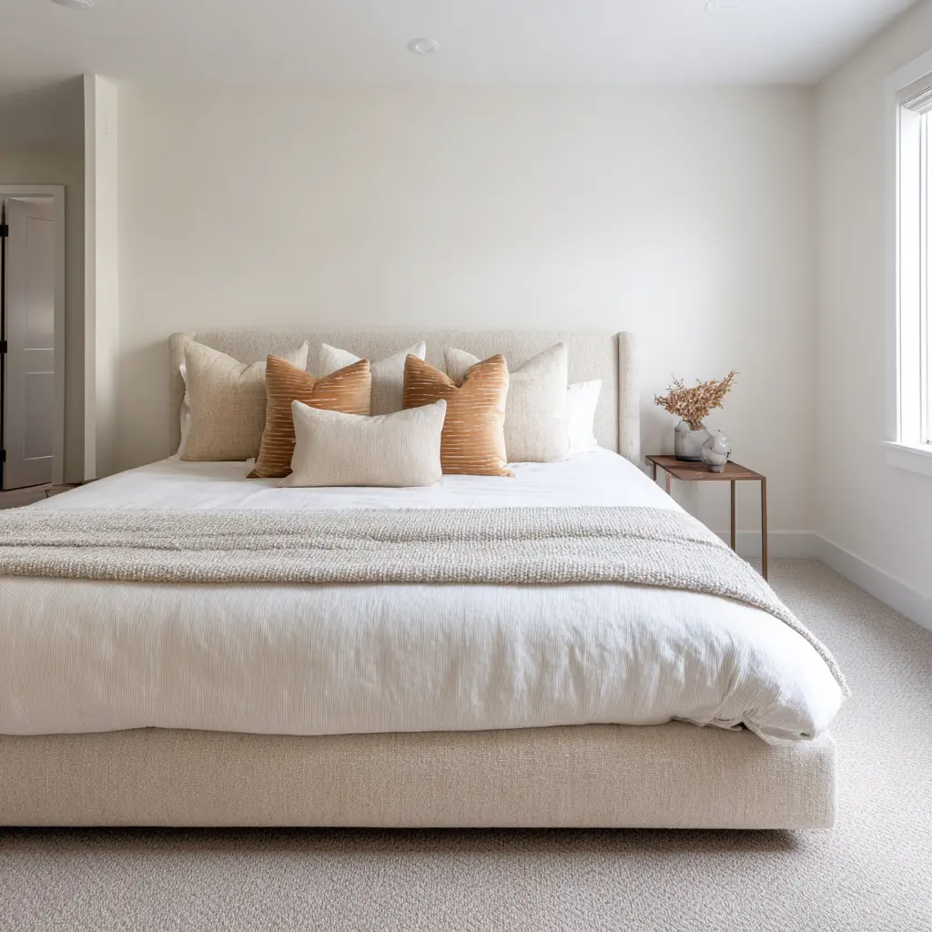 A bedroom can have a beautiful upper half and still fail to feel restorative if the lower zone is visually broken. Calm interior designs soften the floor level with: