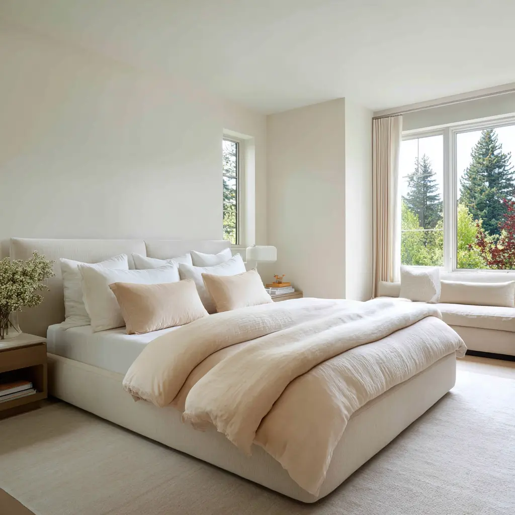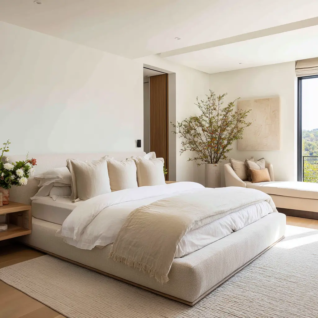 A calm room should not feel cluttered, but it should not feel empty either. Calm primary bedroom design ideas shift richness away from loud color and busy detail and place it in quieter things: surface texture, slight tonal steps, dry-looking wood, soft shadow, filtered daylight, and greenery outside the window.
