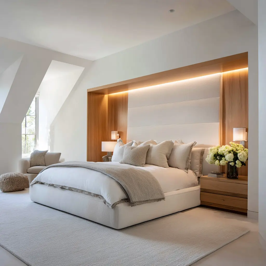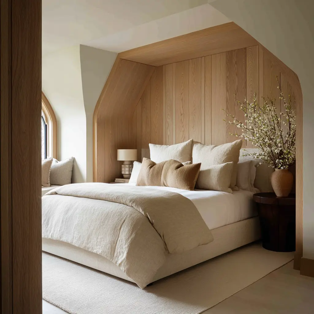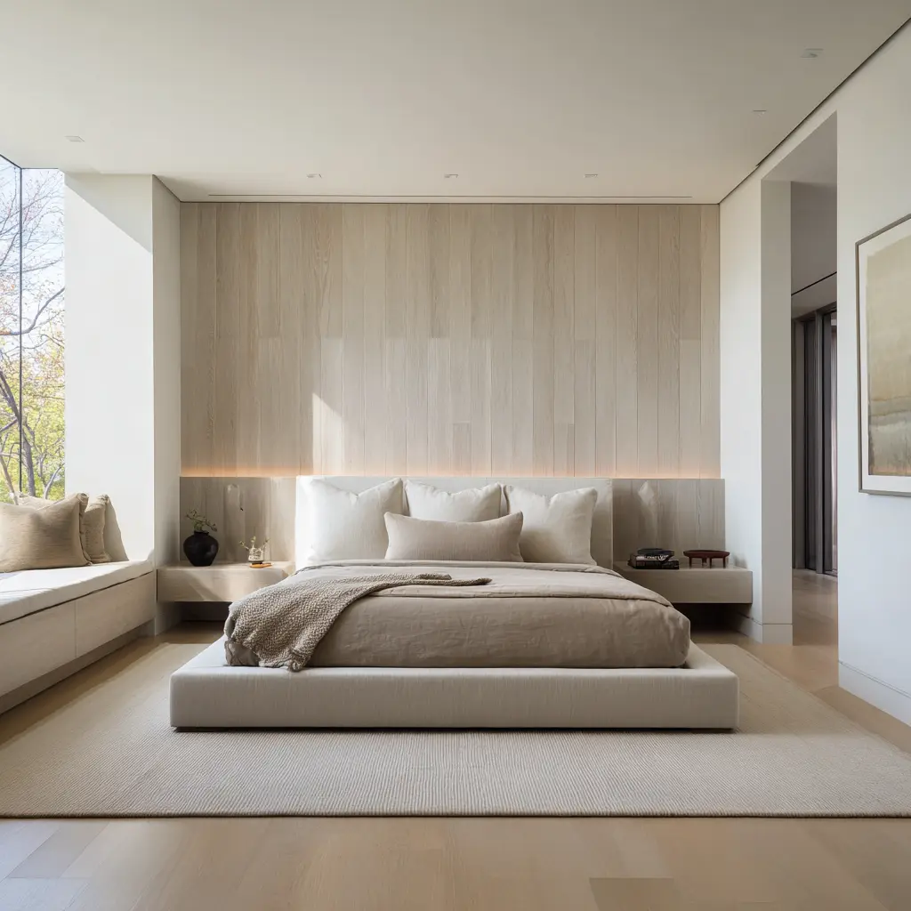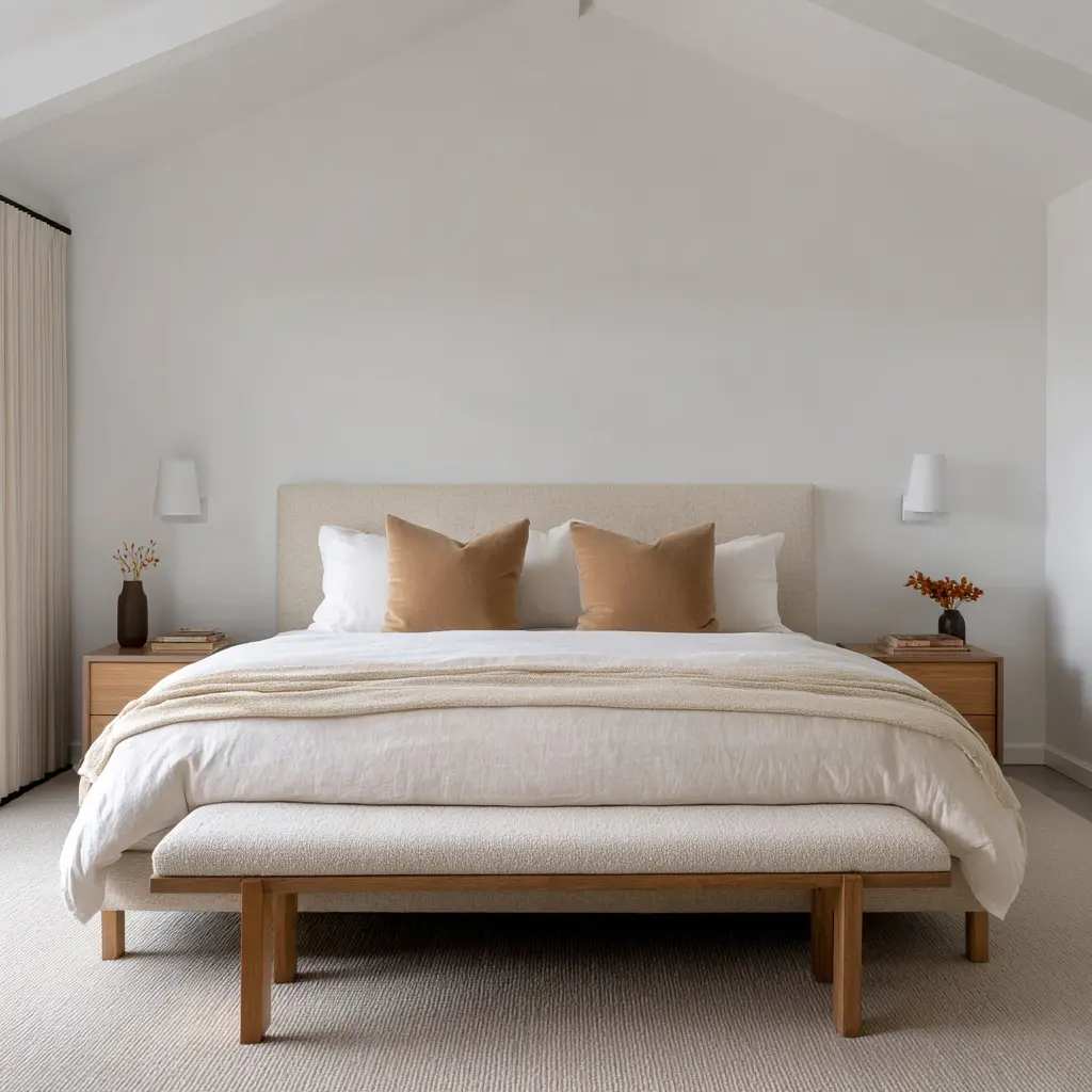 In a retreat bedroom, broad low-intensity features outperform many small interesting details. A large soft wall, a long bench, a wide rug, a broad headboard, or a full wall of pale wood often does more for the room than a collection of smaller decorative moments.