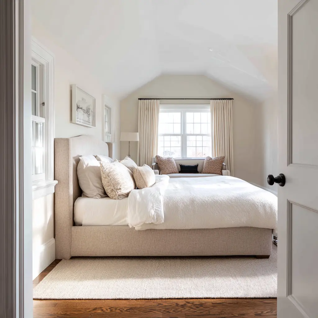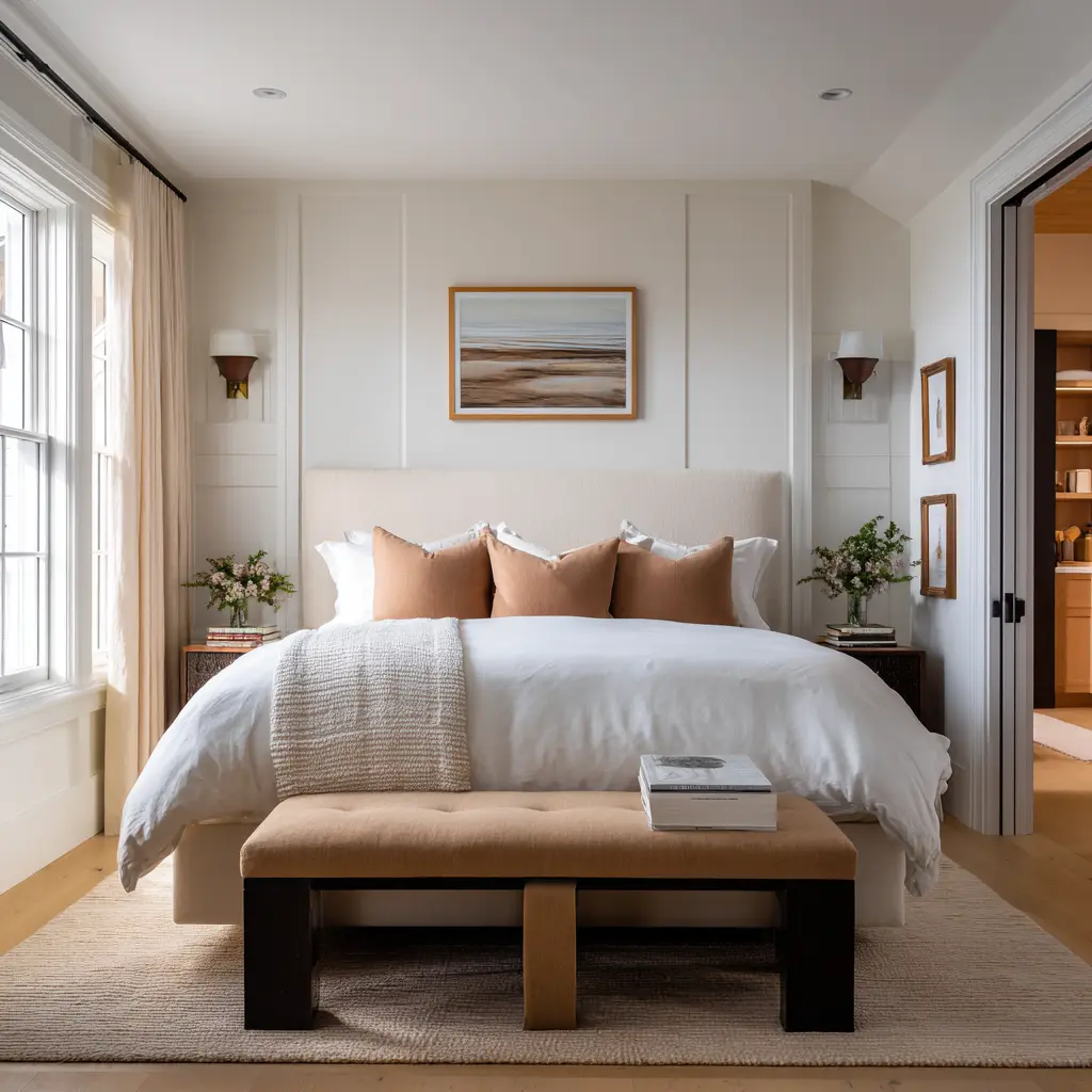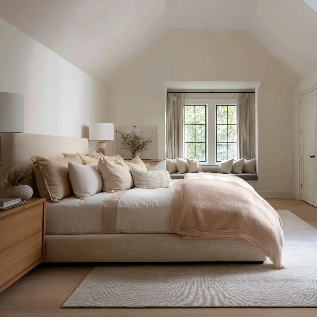 A bench by a window, a built-in daybed, a small chair in a bright corner, or even a soft bench at the foot of the bed tells the body that this room is meant for staying, not only for collapsing into bed at the end of the day. So the retreat effect is not about decorating more.