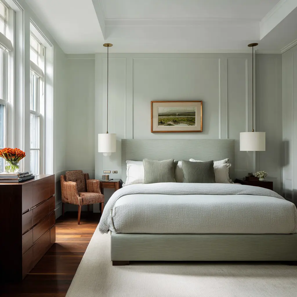 A calm retreat bedroom does not have to be beige. Effective calm bedroom designs can use pale sage, warm ochre, dusty lavender accents, soft rust notes, or camel details.
