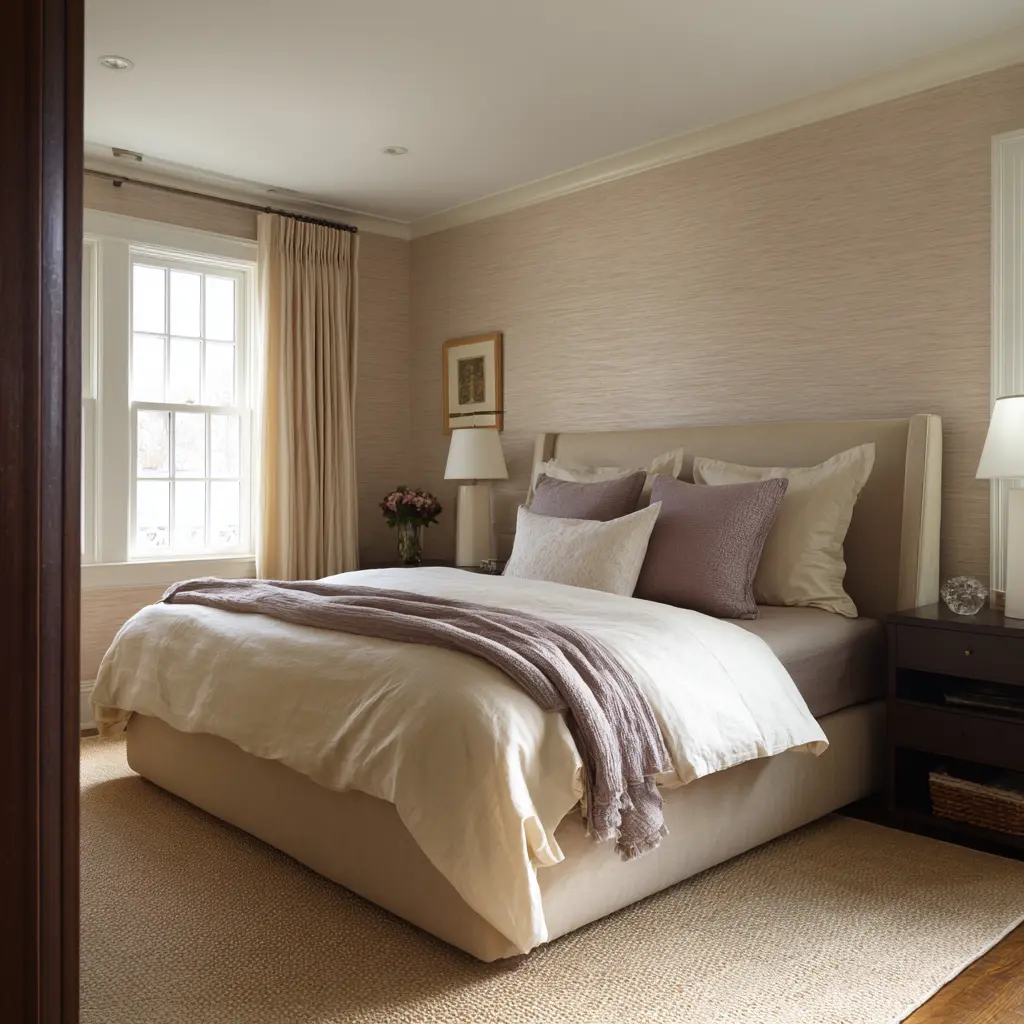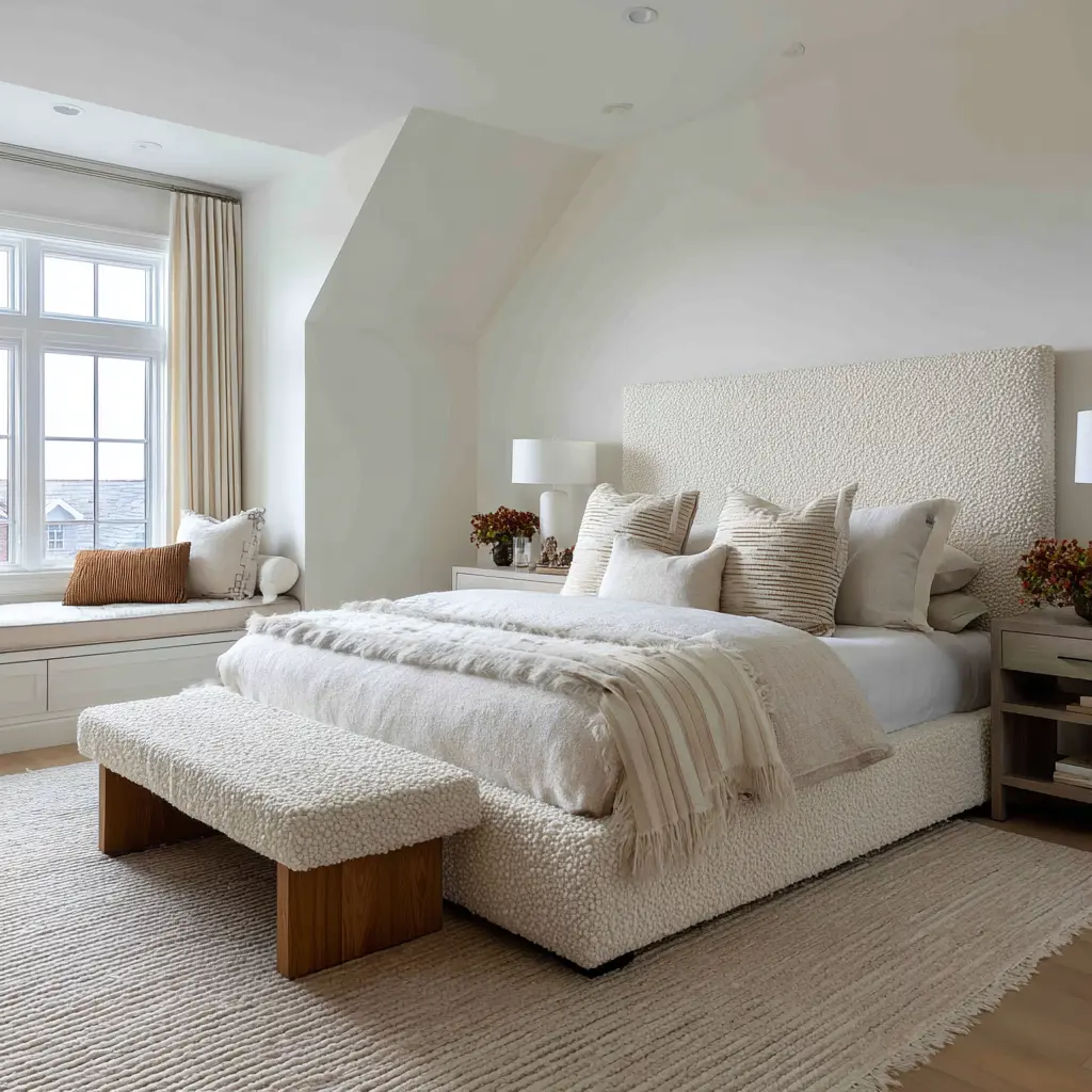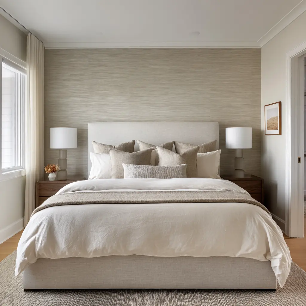 If the color palette is quiet, surface behavior becomes even more important. Calm bedrooms can lean heavily on matte, dry-looking materials: upholstery, woven wallcoverings, soft rugs, pale painted walls, linen-like bedding, washed woods, bouclé-like upholstery, and other low-sheen finishes.
