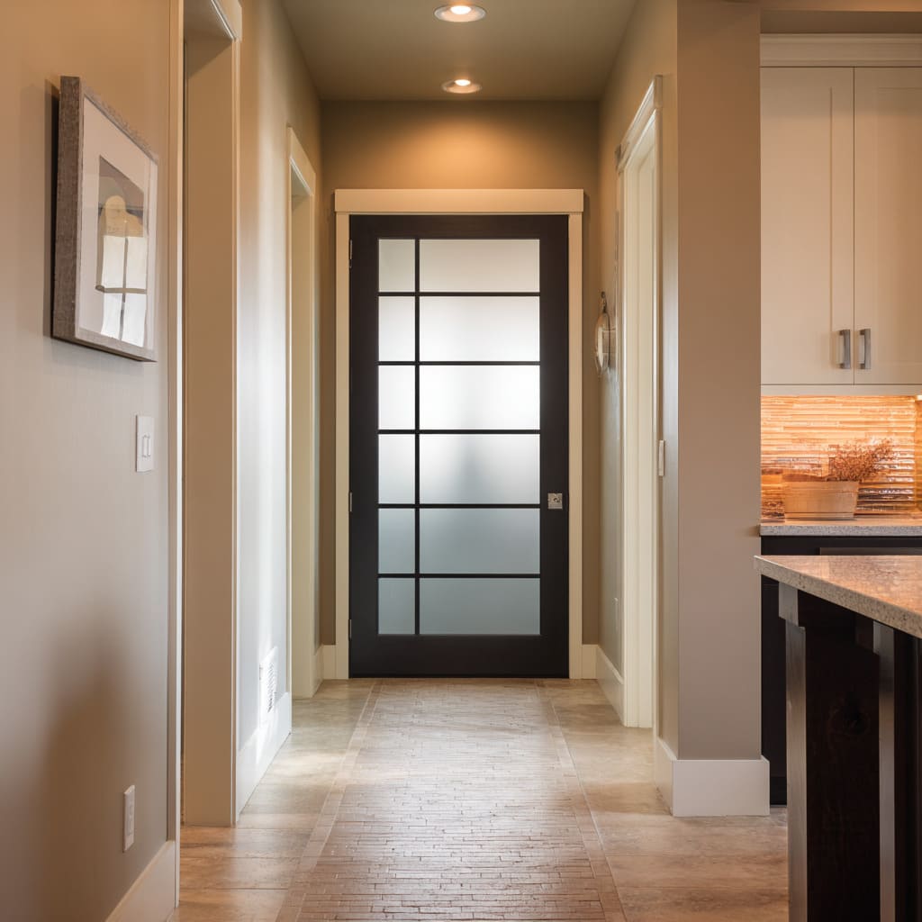 This can happen through solid lower sections, denser frosting near the bottom, or pane arrangements that naturally give the lower zone more visual mass. Even when the door is mostly glass, slight shifts in tone—upper zones reading lighter, lower zones reading deeper—build an architectural gravity that feels quietly satisfying.