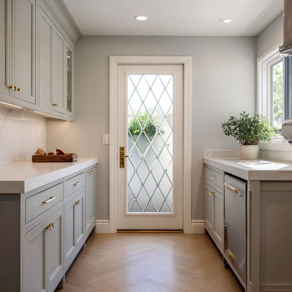 When warm metal repeats in measured doses, the design gains a consistent gentle shimmer that balances cool paint and glass brightness without turning the door into a flashy moment. Equally important is the relationship between matte and sheen: matte cabinetry can support a luminous glass panel by absorbing competing reflections, while stone or glazed tile can add controlled sparkle that harmonizes with textured glass.