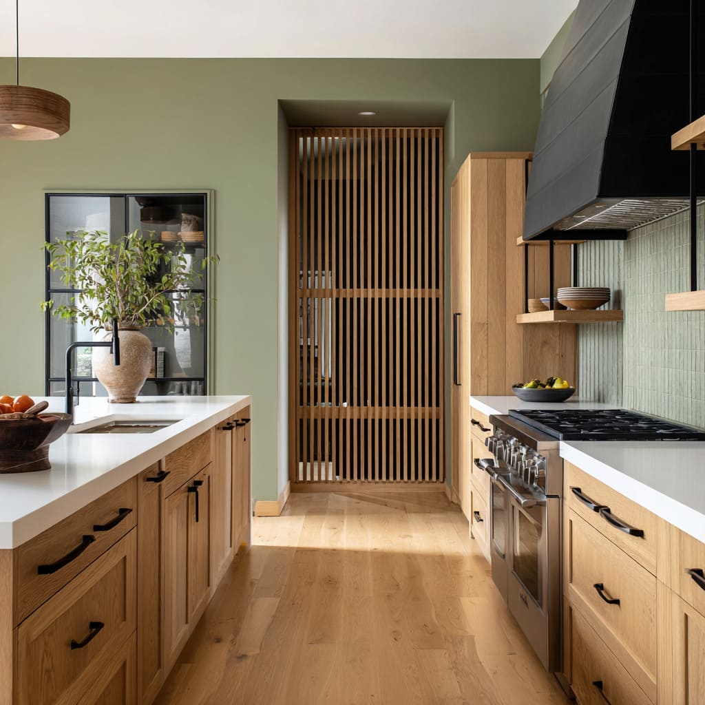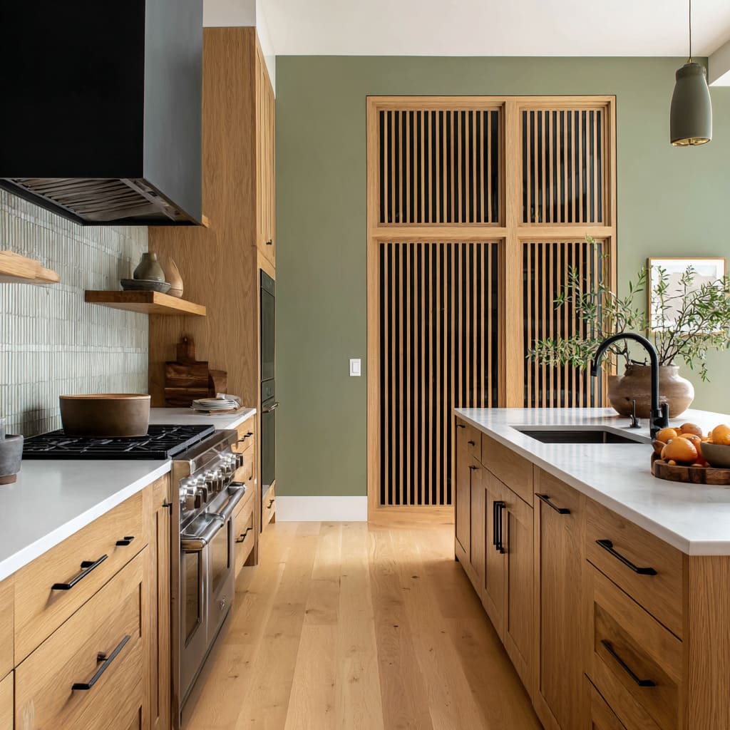 - Rhythm echo: reeded glass paired with fluted wood on an island face, or grid logic repeated in woven stool textures and basket weaves.
